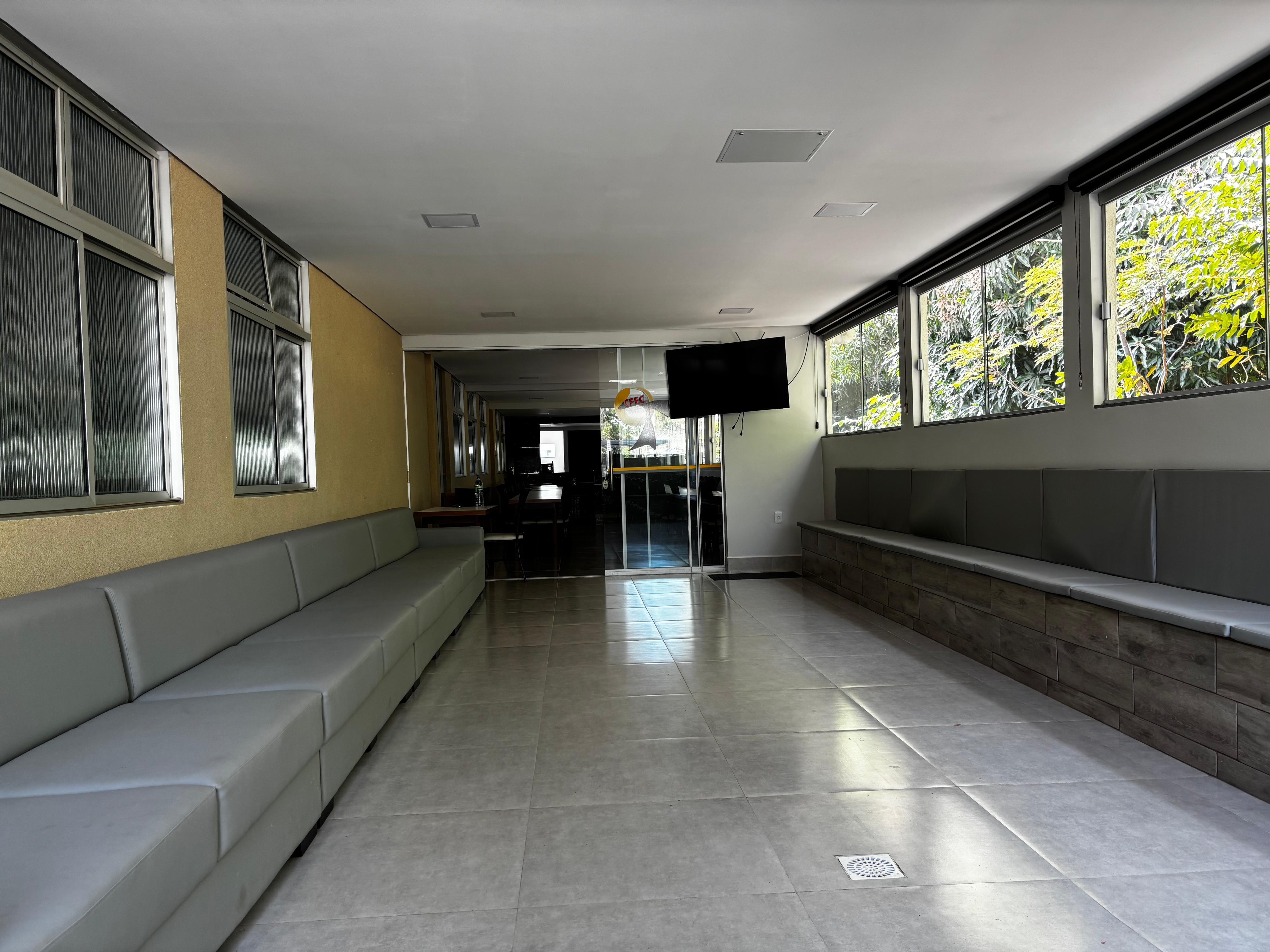 Dispomos de uma área verde ampla com um quiosque. Corredores com vista panorâmica para o jardim e área de recreio com TV e sofás