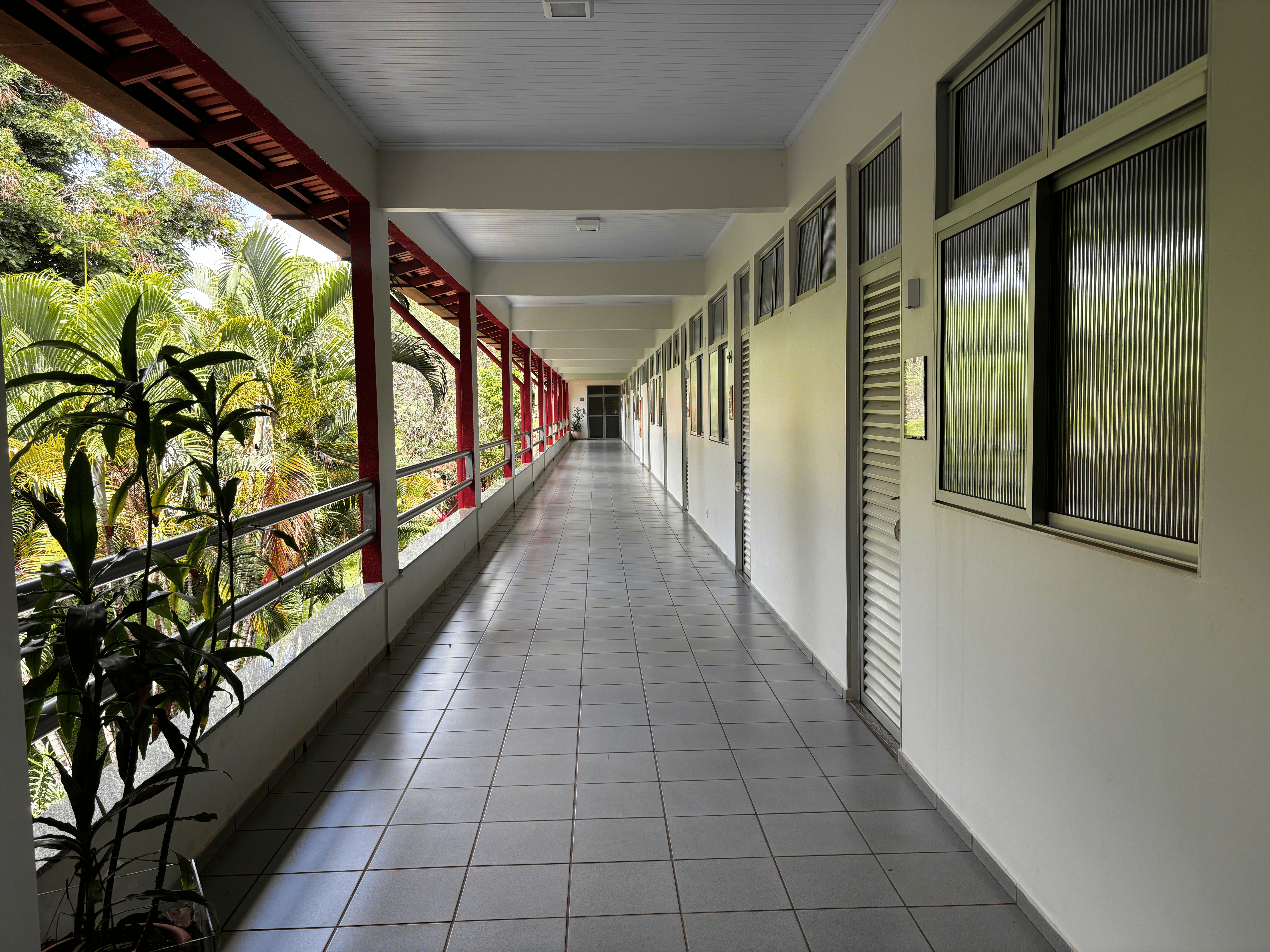 Dispomos de uma área verde ampla com um quiosque. Corredores com vista panorâmica para o jardim e área de recreio com TV e sofás