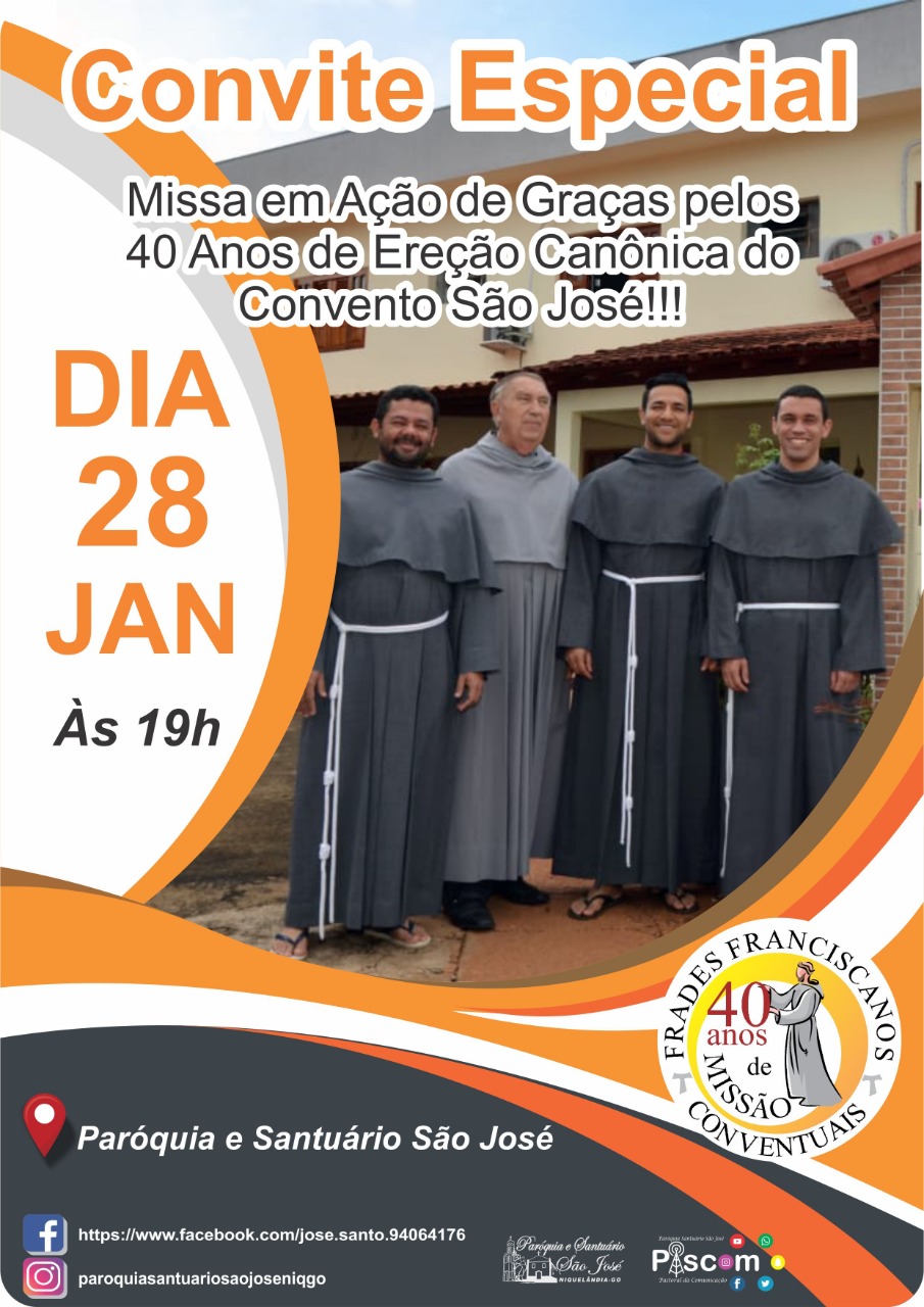 Hoje, às 19h, será celebrada uma Santa Missa em ação de graças à ereção canônica do Santuário São José. A Eucaristia contará com a presença dos frades da comunidade, Frei Herton Alcântara (OFMConv.), Frei Regildo Piedade (OFMConv.), Frei José Maria Stankiewicz (OFMConv.), Frei Marcus Orlando (OFMConv.) e além destes, também participarão o Ministro Provincial e ex-pároco, Frei Gilberto de Jesus (OFMConv.) e o Frei Eusébio Wargulewski (OFMConv.), que tem uma história antiga com a comunidade.