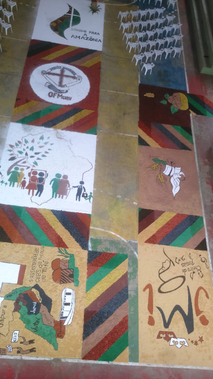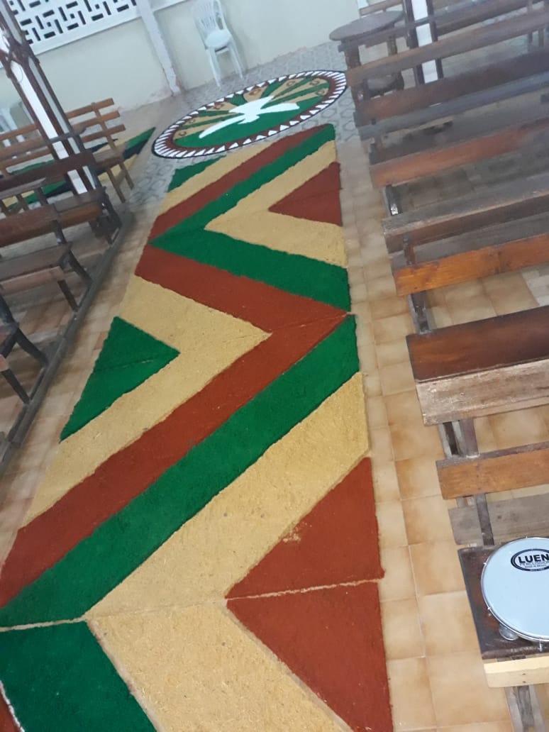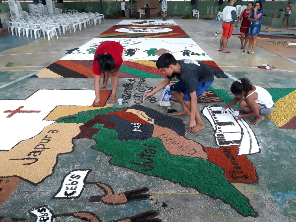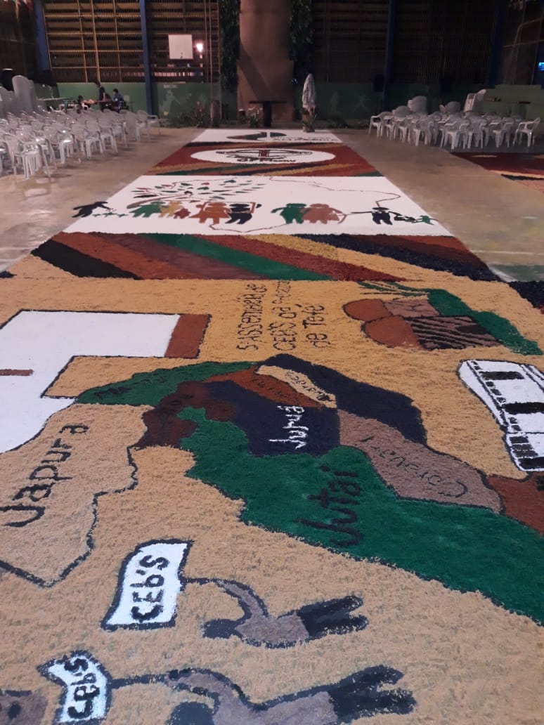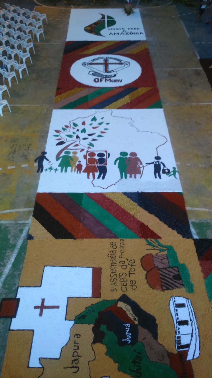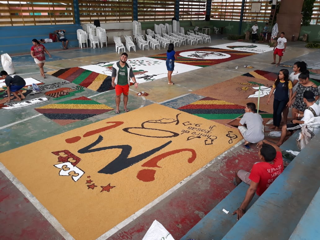 “O que foi bonito (e é o que eu sempre admiro em Juruá) é justamente a grande participação dos jovens e de todos os movimentos e pastorais de nossa comunidade”, comentou Frei Flávio sobre a celebração de ontem. Os tapetes foram confeccionados com as seguintes temáticas: Sínodo da Amazônia, da Assembleia de CEBs, os 30 anos da Pastoral da Criança na Prelazia de Tefé, a Campanha da Fraternidade e todos os motivos eucarísticos.