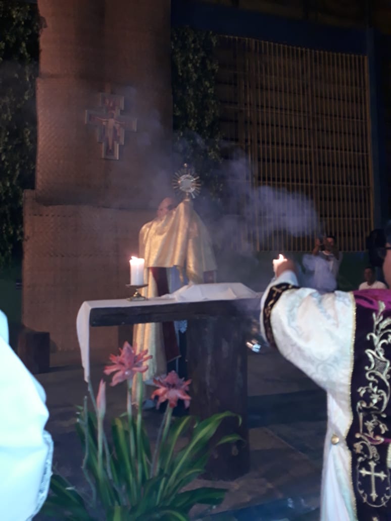Iniciando a celebração, às 18h, foi feita a exposição do Santíssimo Sacramento na Igreja Matriz. Logo em seguida, foi iniciada a exposição na praça da matriz, onde foi rezado o primeiro evangelho. Depois, os fiéis se dirigiram ao Oratório de Nossa Senhora de Fátima, a primeira igreja da cidade, onde foi rezado o segundo evangelho.