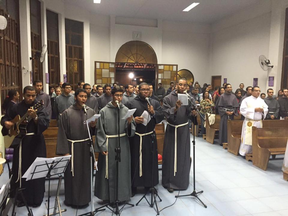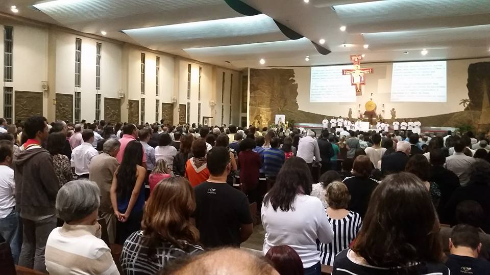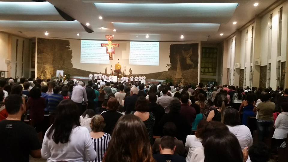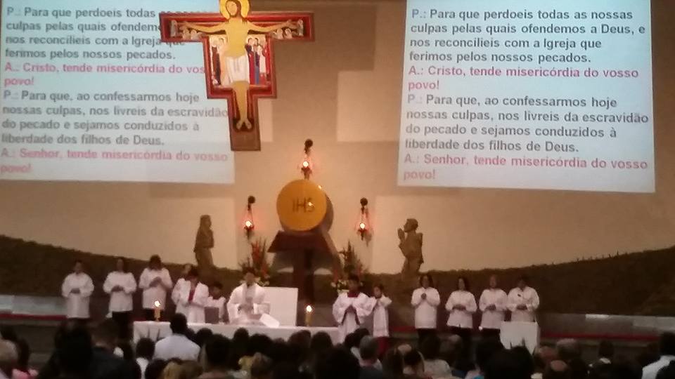 À noite, na Santa Missa Penitencial, a nave central do Santuário São Francisco de Assis estava lotada, faltou lugares, até as escadas de acesso à porta principal foram ocupadas. Tudo isso para celebrar os 800 anos de uma das ações de São Francisco.