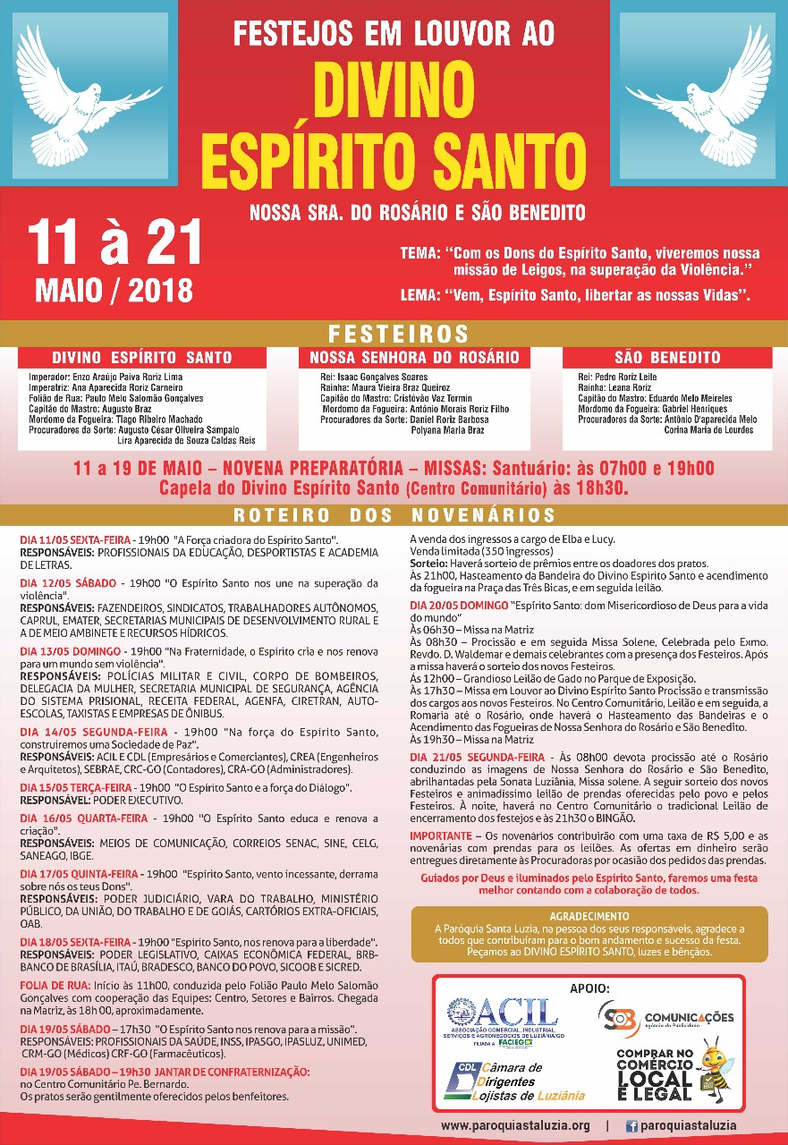 Começam nesta sexta-feira, 11, os festejos em louvor ao Divino Espírito Santo, Nossa Senhora do Rosário e São Benedito na Diocese de Luziânia. As celebrações deste ano, que vão até o dia 21 deste mês, têm como tema “Com os Dons do Espírito Santo, viveremos nossa missão de leigos, na superação da violência” e seguem o lema “Vem, Espírito Santo, libertar as nossas vidas”. Durante este período, serão realizadas novenas, folias de rua, procissões, jantares, barraquinhas e as celebrações da Santa Missa. Segue a programação: