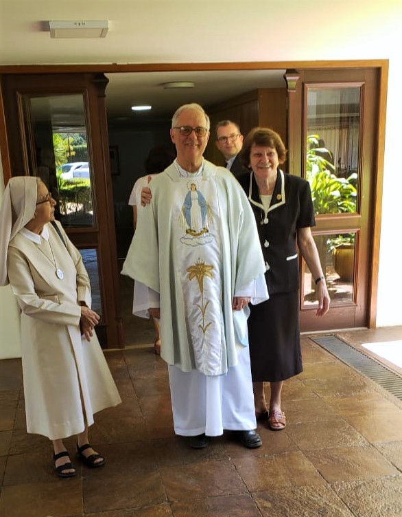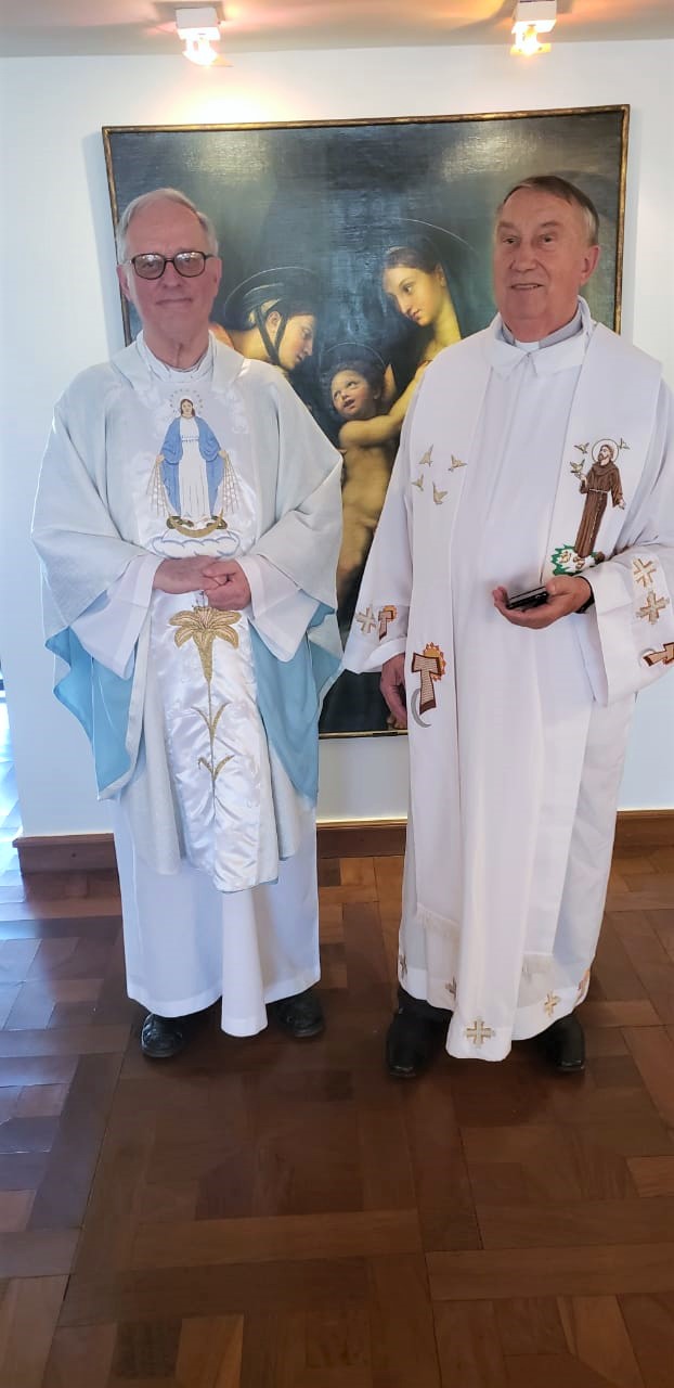 Os frades jubilares de nossa província acompanharam felizes, o provincial Frei Marcelo Veronez (OFMConv.), o vigário provincial Frei Miecislau Tlaga (OFMConv.), o Frei Casimiro Cieslik (OFMConv.) e o diácono Frei Wagner Faustino (OFMConv.). Participaram ainda todos os que vivem e trabalham na Nuciatura Apostólica, bem como as Irmãs Palacianas.