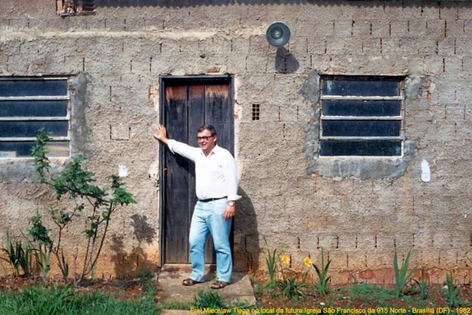 Em 10 de agosto de 1981, os franciscanos conventuais deram início à sua presença na capital federal. Neste mesmo dia, há 37 anos, estavam sendo realizadas as construções do que viria a ser o atual Santuário São Francisco de Assis (915 Norte). O Frei Miecislau Tlaga, que atualmente reside no Convento Santo Antônio de Pádua, em Valparaíso (GO), foi o primeiro frade a chegar e trabalhar no santuário. Nas fotos estão o primeiro barraco onde, por meses, morou Tlaga no terreno das Irmãs Franciscanas da Sagrada Família. As companheiras franciscanas deram grande suporte aos frades menores conventuais no início de sua presença em Brasília. Também está nas fotos o frei Miecislau ao chegar na região, o primeiro barraco da Paróquia São Francisco de Assis com o casal de paroquianos Olga e Brenno e a famosa Sucupira Inclinada, a sala de reuniões da juventude.