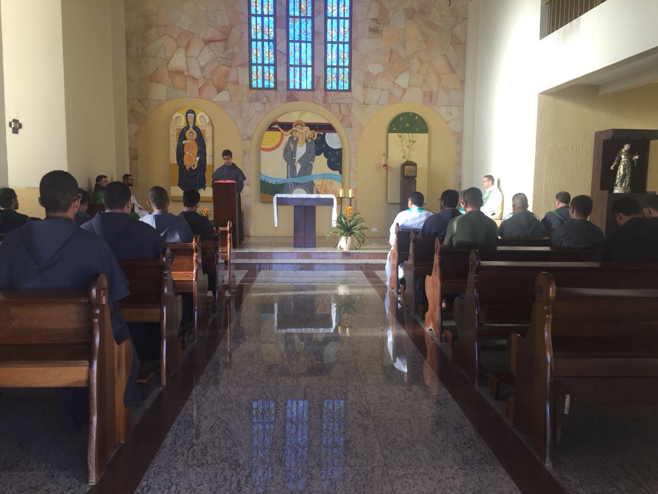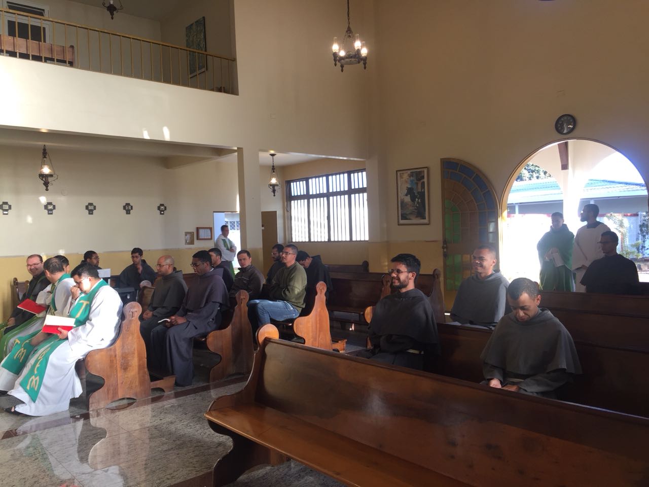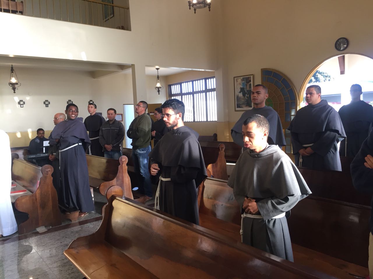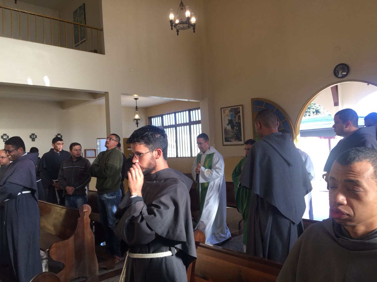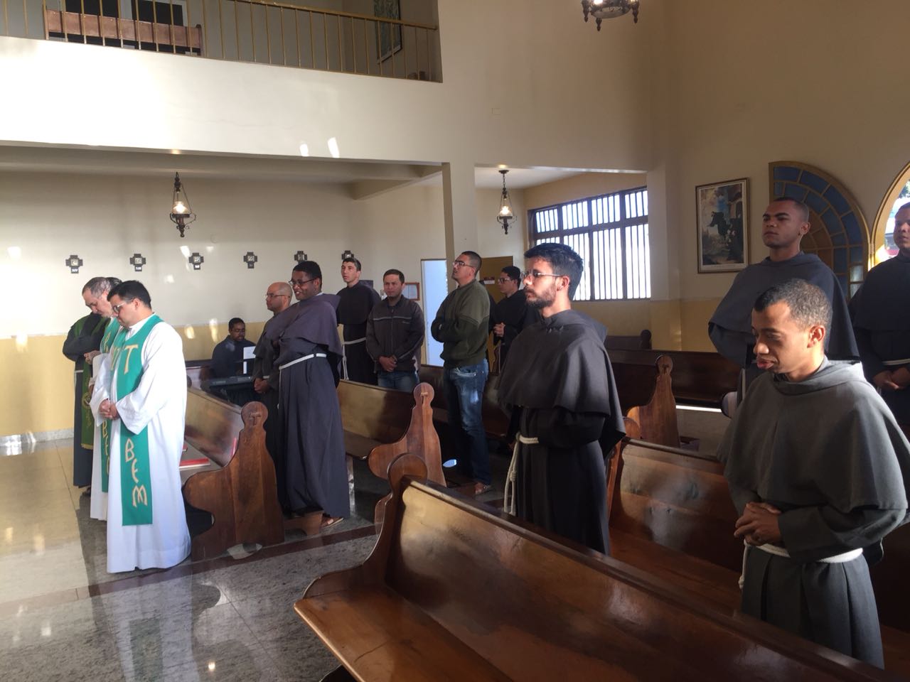 Ainda pela manhã, os confrades dos conventos vizinhos, São Francisco e de São Boaventura, dirigiram-se à Casa de Formação para a celebração da Santa Missa na Capela São Francisco de Assis. Em sua homilia, Frei Carlos ressaltava a importância de nos assemelharmos à atitude curativa de Jesus, expressa no evangelho do dia (cf. Mt 8, 5-17). Segundo ele, as curas que Jesus realiza têm seu sentido pedagógico na medida em que nos mostra como devemos ser “portadores da cura”, isto é, homens e mulheres que sejam sinais da sadia vida evangélica em nossos contextos. Se podemos encontrar em Jesus a cura de nossas mazelas, como seus discípulos também devemos imitá-Lo em sua postura de restauração das relações. Isso se evidencia, sobretudo, em nossa profissão religiosa, uma vez que Francisco de Assis é, de fato, um homem que se deixa ser curado e sempre se põe em vias de irradiar esta cura.