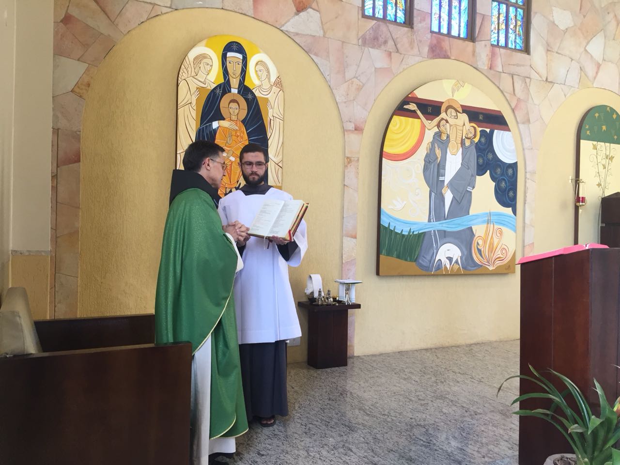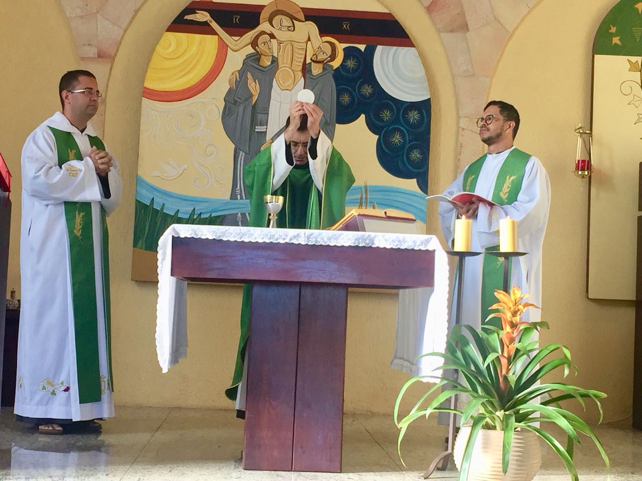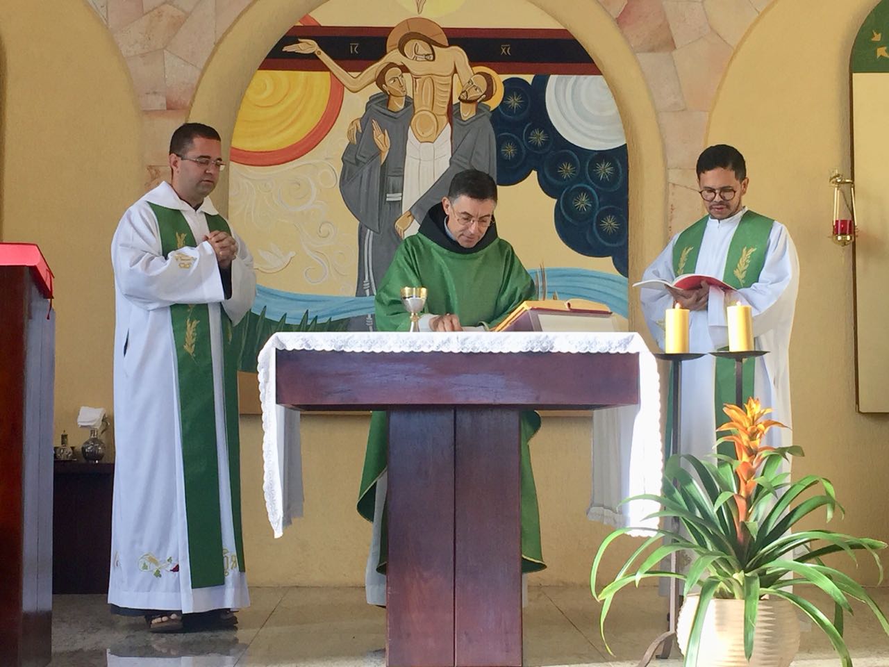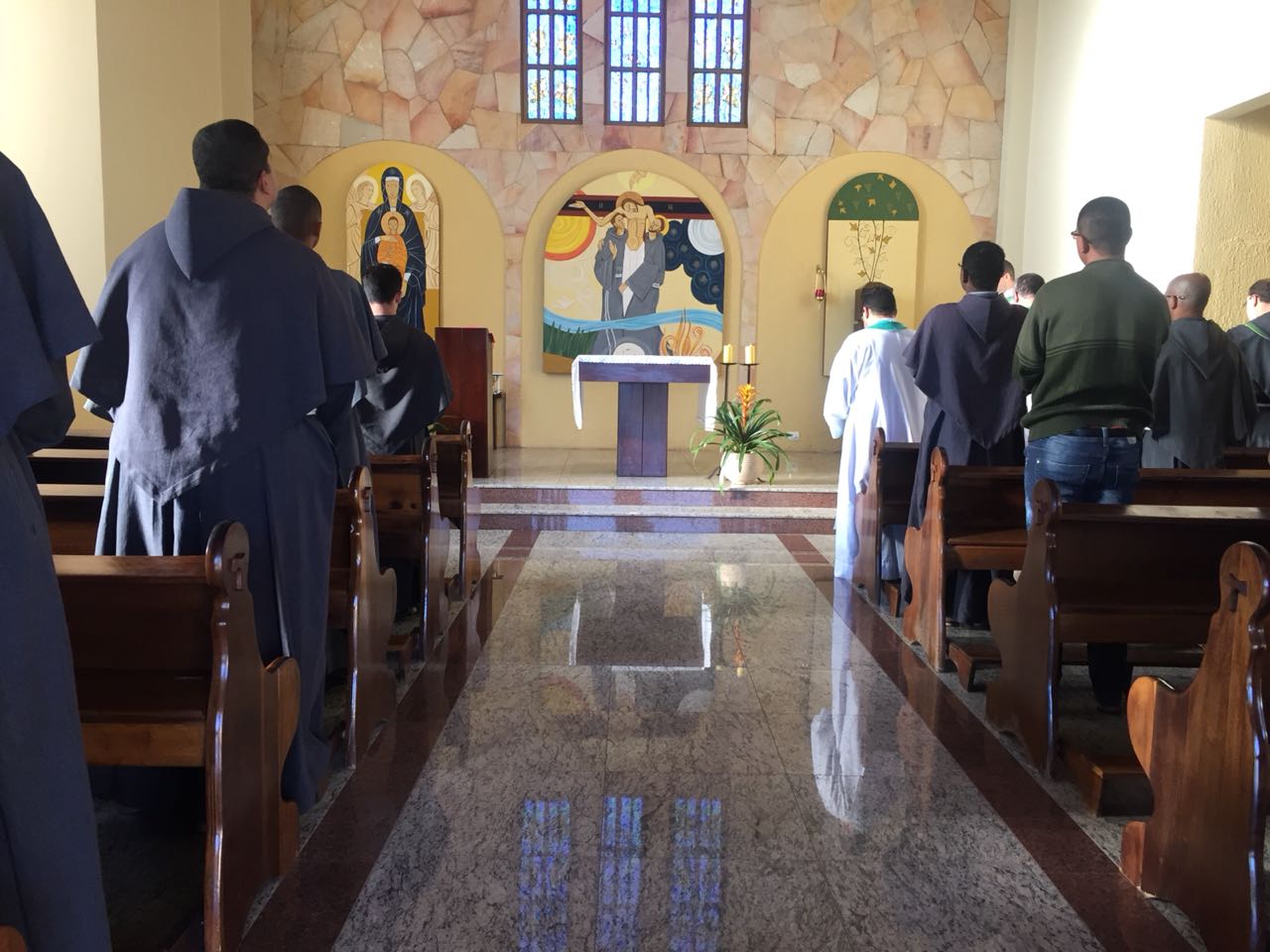 Ainda pela manhã, os confrades dos conventos vizinhos, São Francisco e de São Boaventura, dirigiram-se à Casa de Formação para a celebração da Santa Missa na Capela São Francisco de Assis. Em sua homilia, Frei Carlos ressaltava a importância de nos assemelharmos à atitude curativa de Jesus, expressa no evangelho do dia (cf. Mt 8, 5-17). Segundo ele, as curas que Jesus realiza têm seu sentido pedagógico na medida em que nos mostra como devemos ser “portadores da cura”, isto é, homens e mulheres que sejam sinais da sadia vida evangélica em nossos contextos. Se podemos encontrar em Jesus a cura de nossas mazelas, como seus discípulos também devemos imitá-Lo em sua postura de restauração das relações. Isso se evidencia, sobretudo, em nossa profissão religiosa, uma vez que Francisco de Assis é, de fato, um homem que se deixa ser curado e sempre se põe em vias de irradiar esta cura.