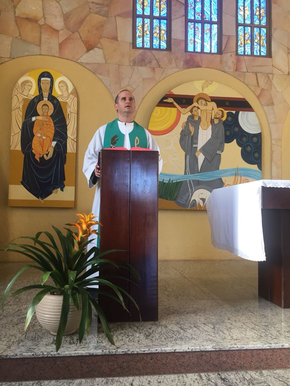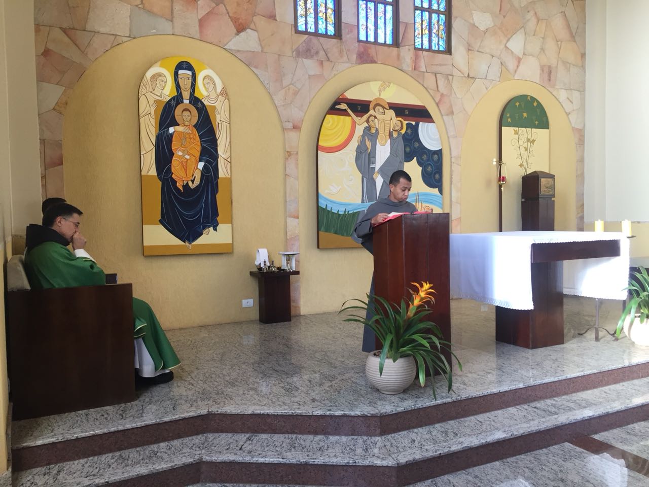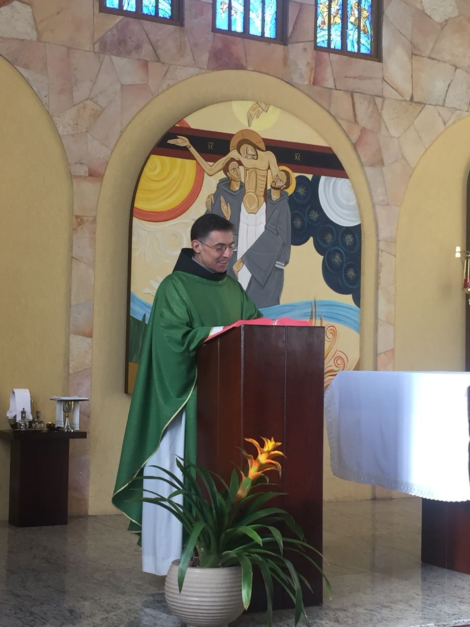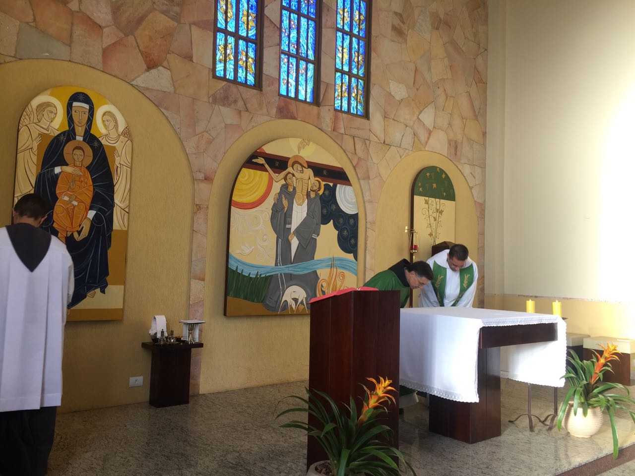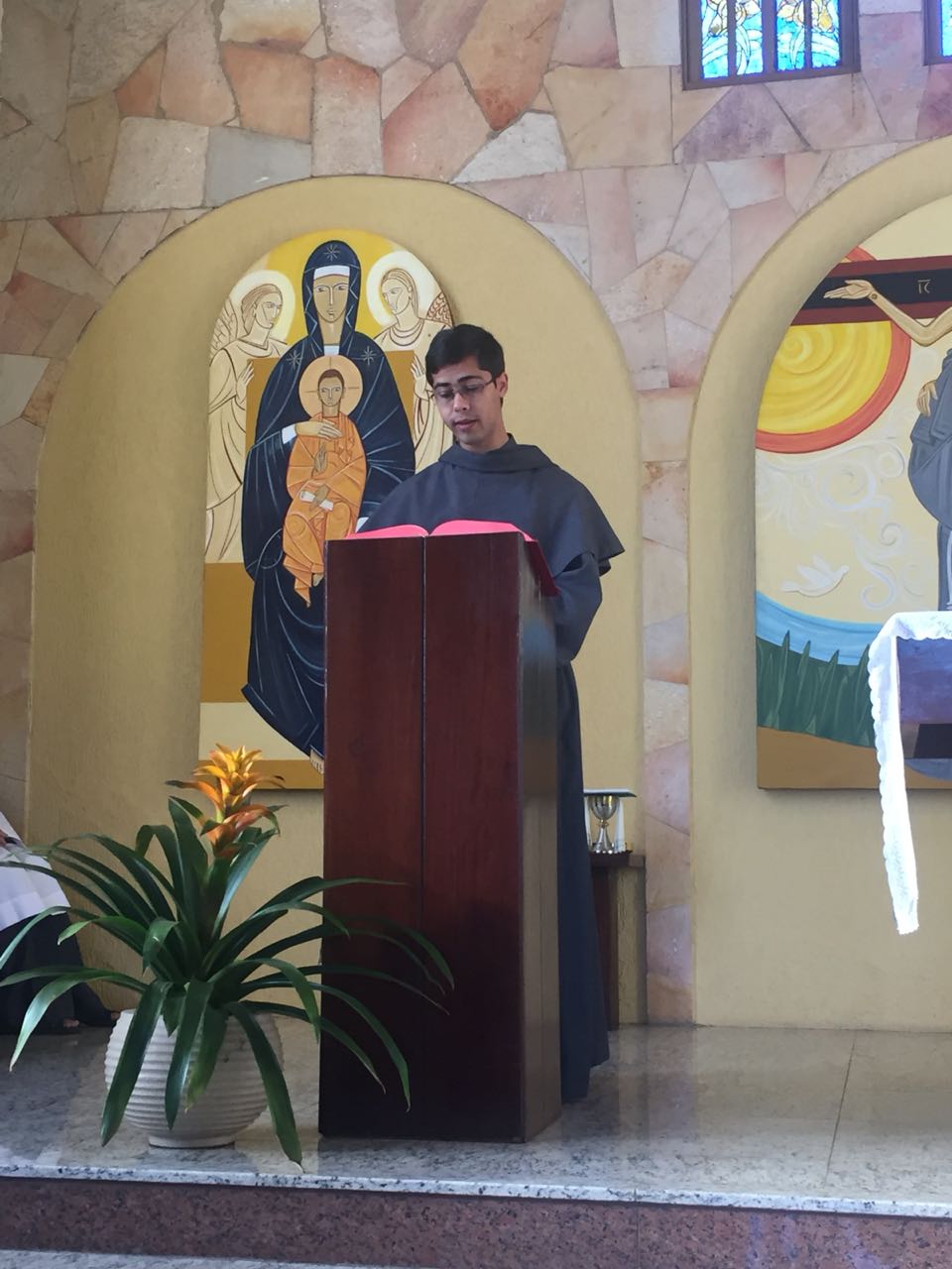 Ainda pela manhã, os confrades dos conventos vizinhos, São Francisco e de São Boaventura, dirigiram-se à Casa de Formação para a celebração da Santa Missa na Capela São Francisco de Assis. Em sua homilia, Frei Carlos ressaltava a importância de nos assemelharmos à atitude curativa de Jesus, expressa no evangelho do dia (cf. Mt 8, 5-17). Segundo ele, as curas que Jesus realiza têm seu sentido pedagógico na medida em que nos mostra como devemos ser “portadores da cura”, isto é, homens e mulheres que sejam sinais da sadia vida evangélica em nossos contextos. Se podemos encontrar em Jesus a cura de nossas mazelas, como seus discípulos também devemos imitá-Lo em sua postura de restauração das relações. Isso se evidencia, sobretudo, em nossa profissão religiosa, uma vez que Francisco de Assis é, de fato, um homem que se deixa ser curado e sempre se põe em vias de irradiar esta cura.