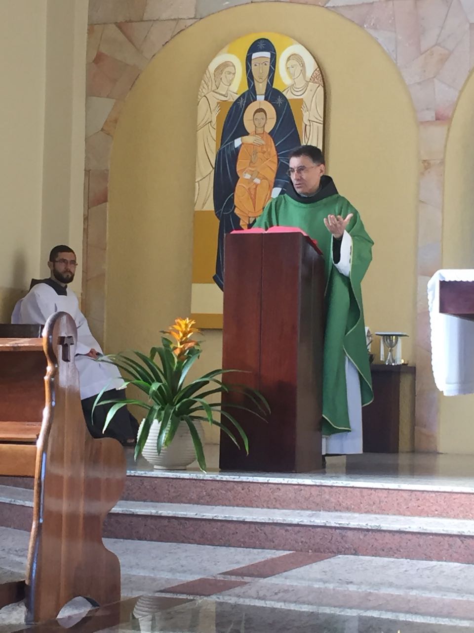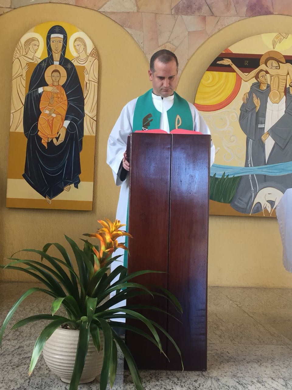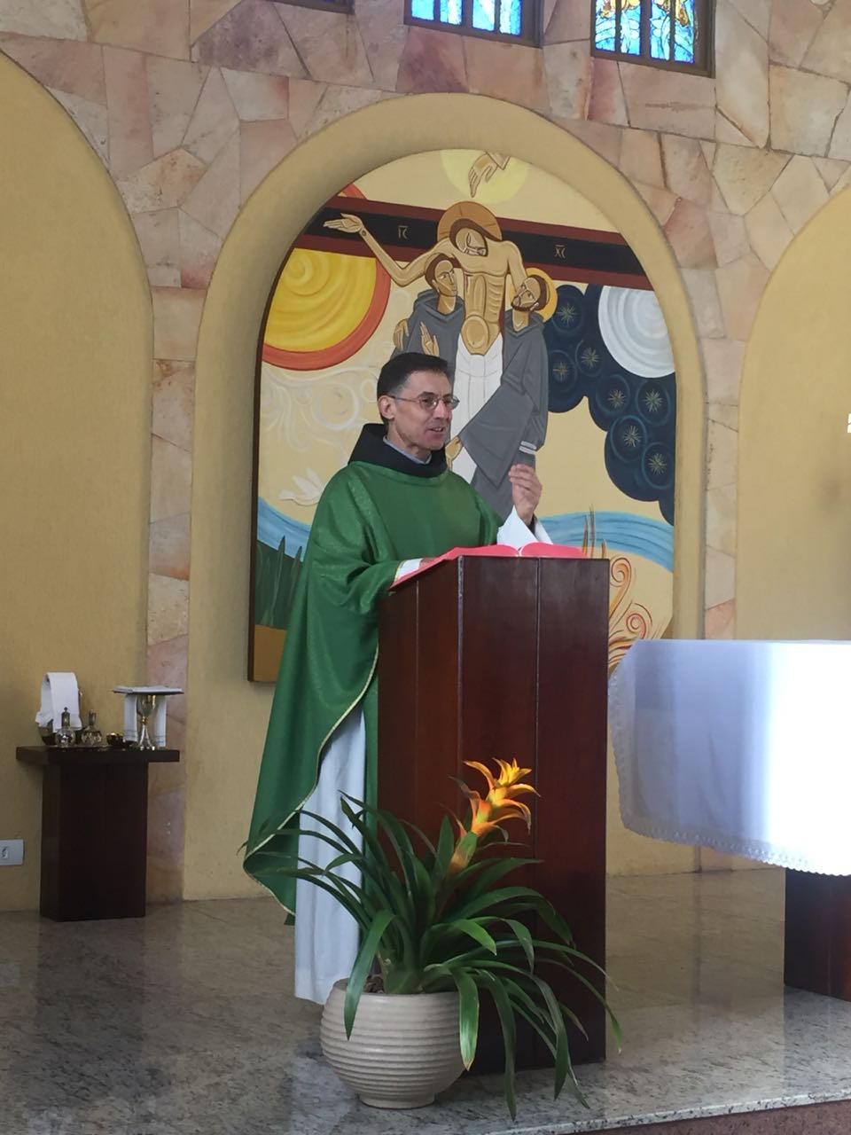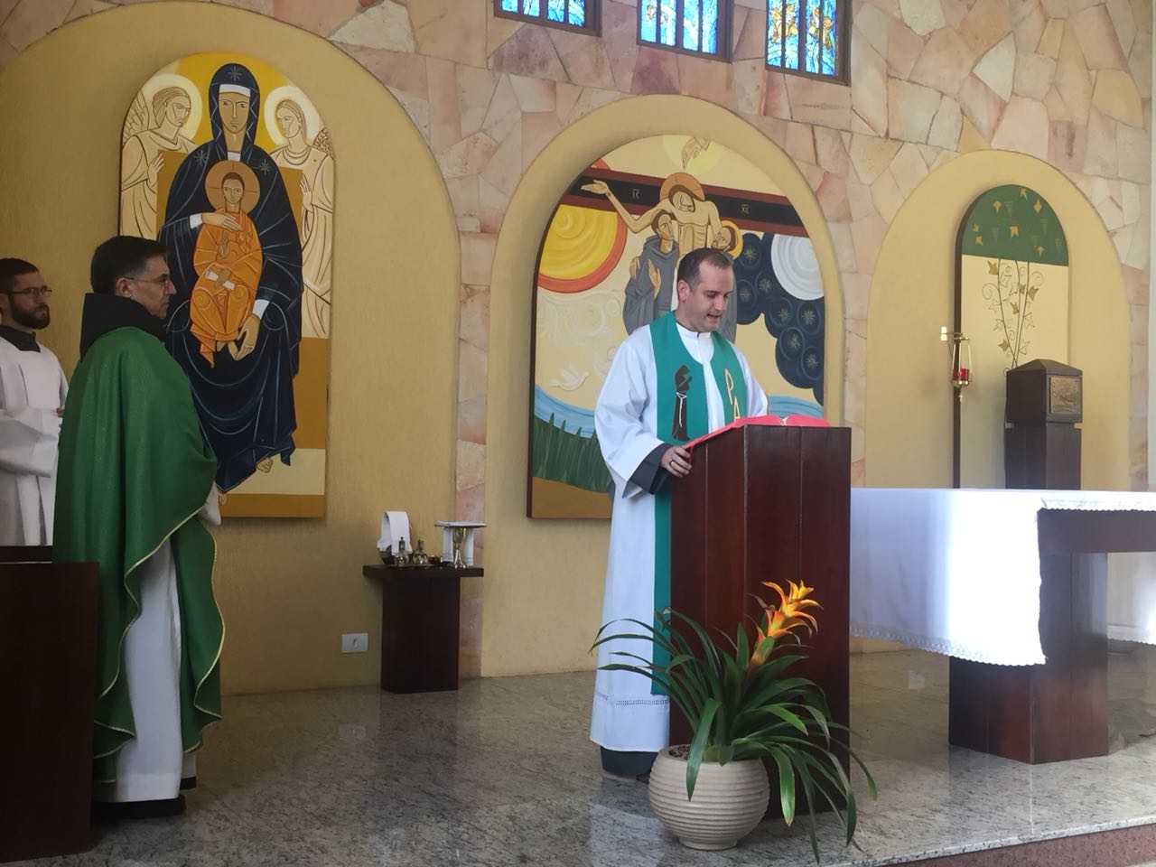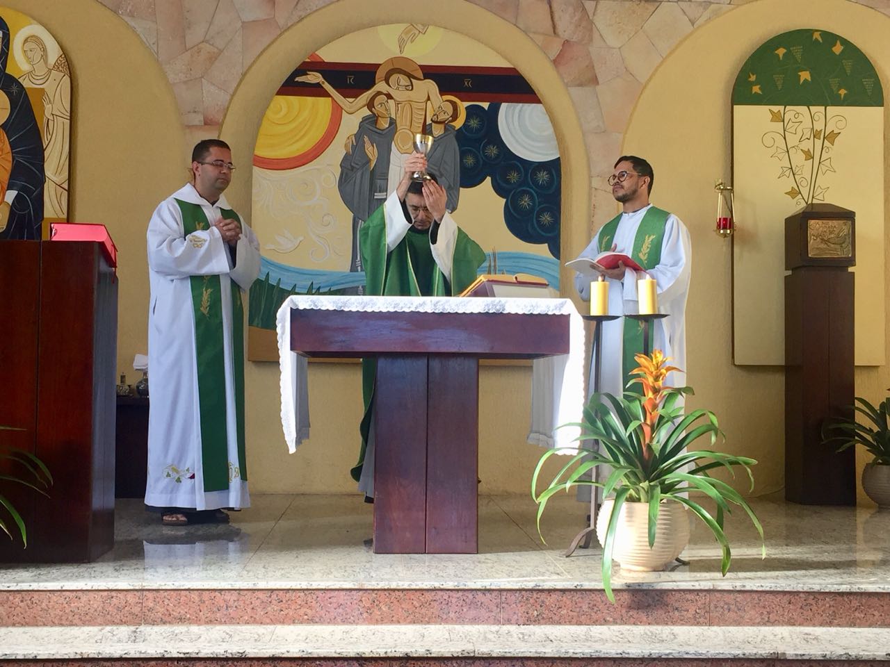 Ainda pela manhã, os confrades dos conventos vizinhos, São Francisco e de São Boaventura, dirigiram-se à Casa de Formação para a celebração da Santa Missa na Capela São Francisco de Assis. Em sua homilia, Frei Carlos ressaltava a importância de nos assemelharmos à atitude curativa de Jesus, expressa no evangelho do dia (cf. Mt 8, 5-17). Segundo ele, as curas que Jesus realiza têm seu sentido pedagógico na medida em que nos mostra como devemos ser “portadores da cura”, isto é, homens e mulheres que sejam sinais da sadia vida evangélica em nossos contextos. Se podemos encontrar em Jesus a cura de nossas mazelas, como seus discípulos também devemos imitá-Lo em sua postura de restauração das relações. Isso se evidencia, sobretudo, em nossa profissão religiosa, uma vez que Francisco de Assis é, de fato, um homem que se deixa ser curado e sempre se põe em vias de irradiar esta cura.