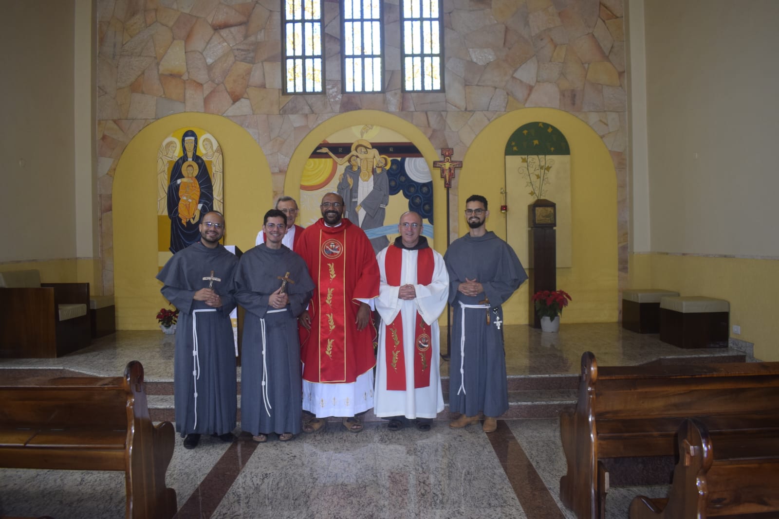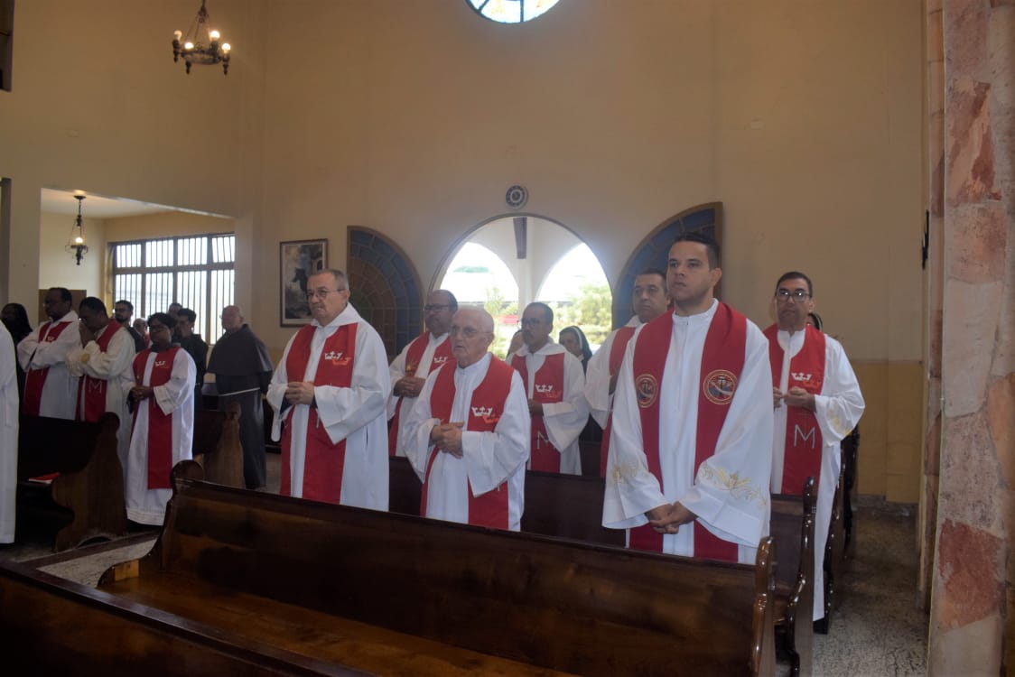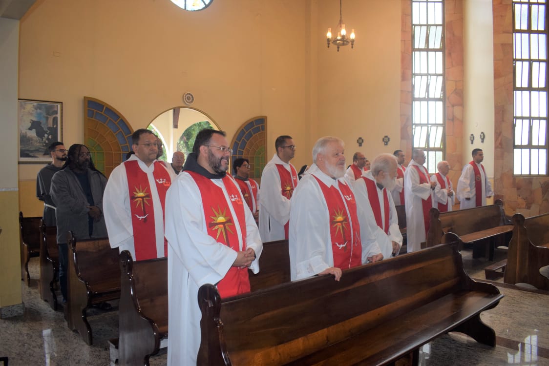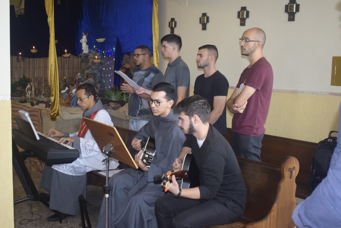Na oportunidade, o Ministro Provincial abençoo a cruz Missionária que foi dada a três de nossos frades professos simples que irão fazer a experiência de um mês no Amazonas.