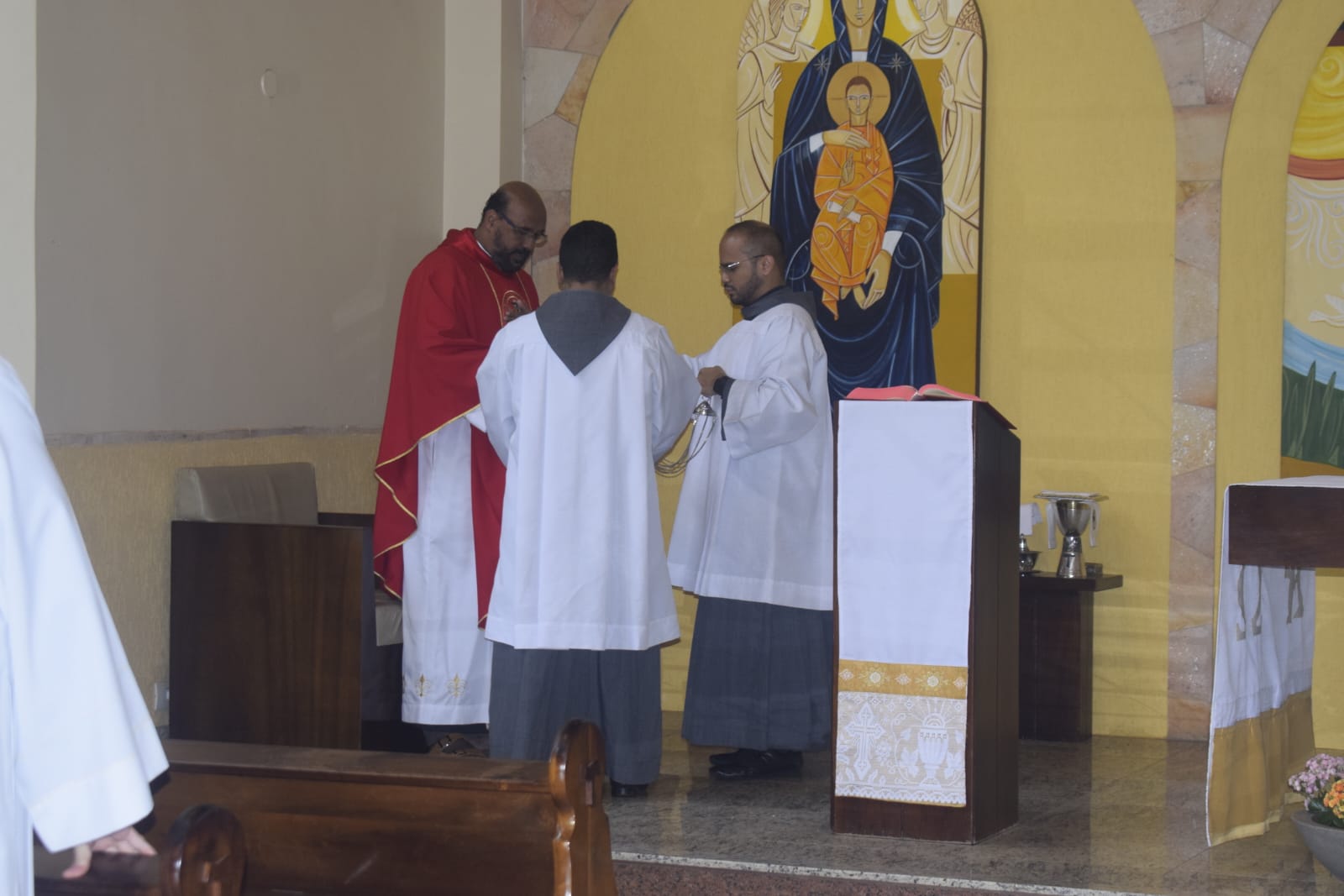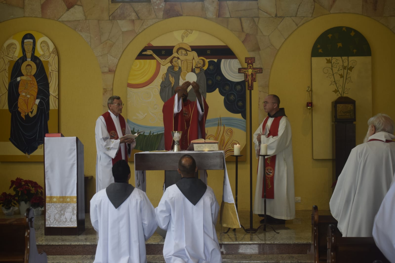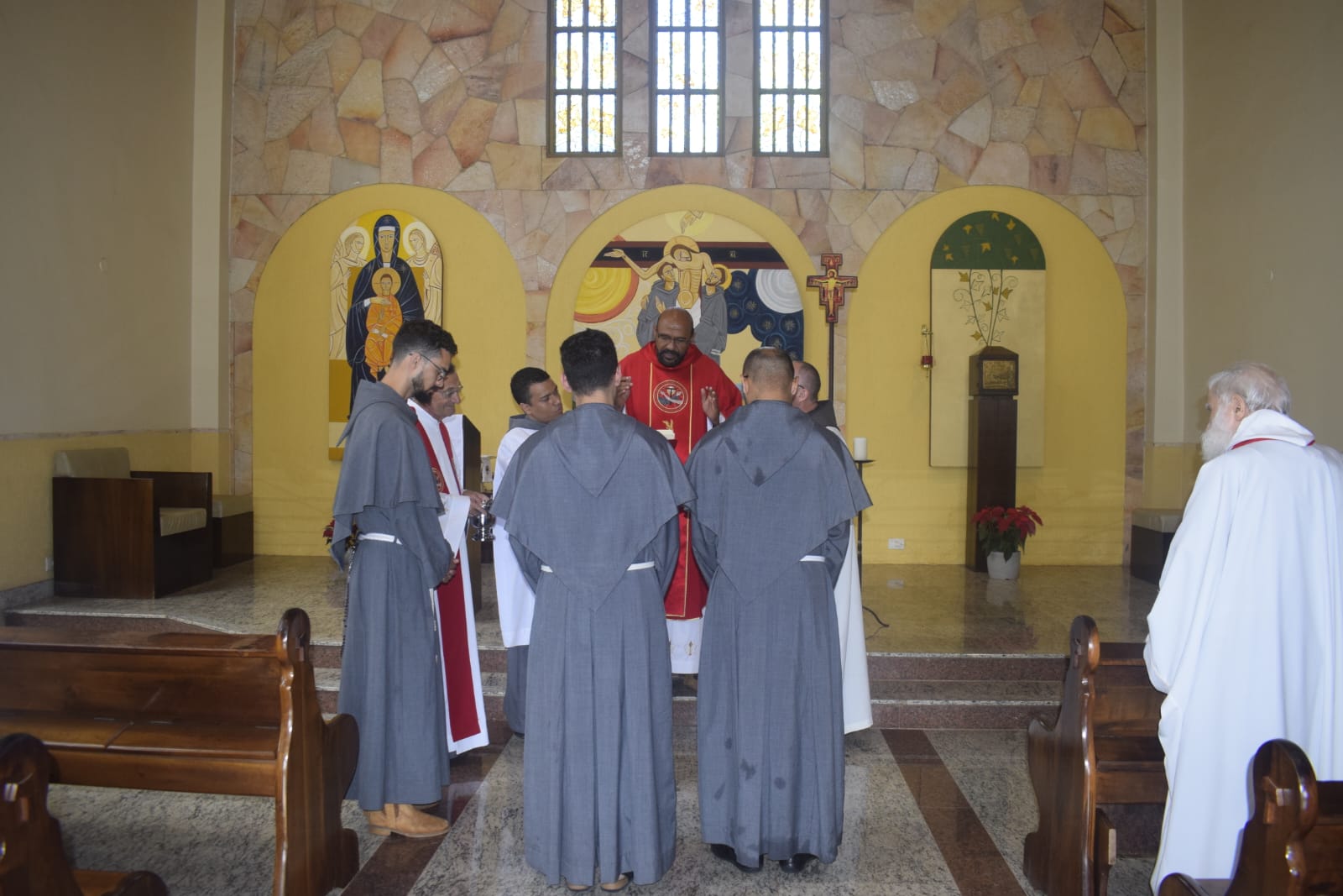 Na oportunidade, o Ministro Provincial abençoo a cruz Missionária que foi dada a três de nossos frades professos simples que irão fazer a experiência de um mês no Amazonas.