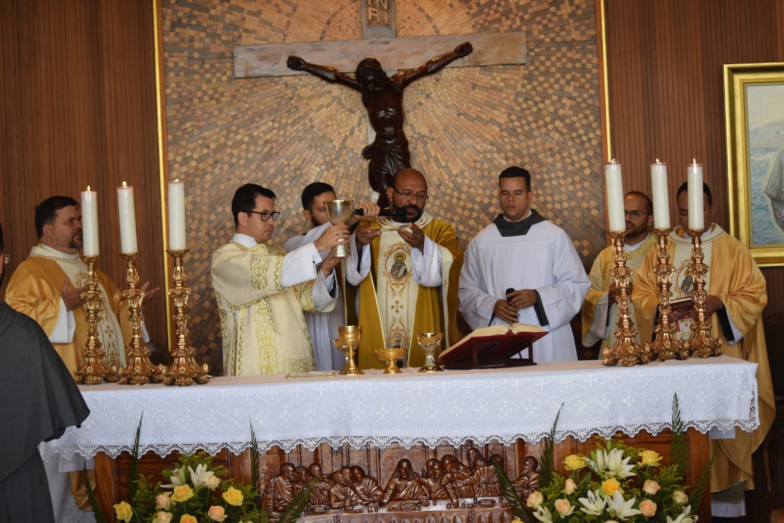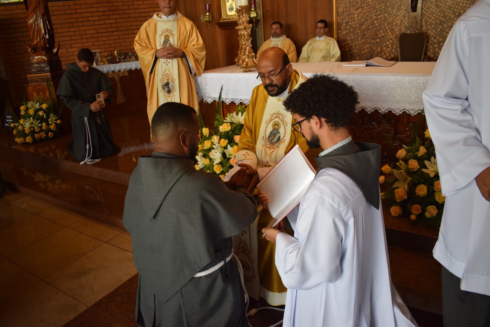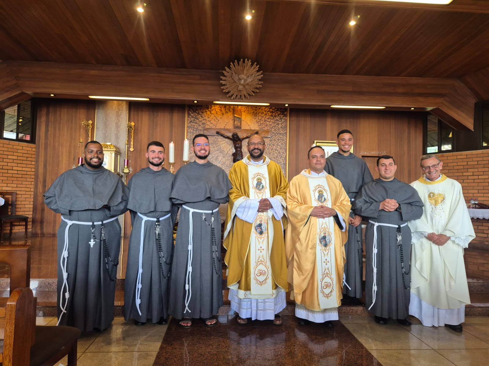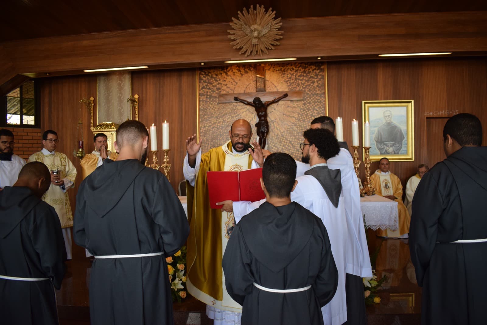 A Província São Maximiliano Maria Kolbe celebrou hoje no último sábado (8), com grande júbilo, a Profissão Simples de Frei Deivid Rodrigues Lira (OFMConv), Frei Gustavo de Guedes Farias (OFMConv), Frei Luan Dias dos Santos (OFMConv), Frei Matheus Andrade S. de Moura (OFMConv) e de Frei Vinicius Santos Lima (OFMConv). A Santa Missa aconteceu às 10h no Santuário Jardim da Imaculada, em Cidade Ocidental – GO, e foi celebrada pelo Ministro Provincial, Frei Gilberto de Jesus (OFMConv) e concelebrada pelo Vigário Provincial, Frei Amilton Leandro (OFMConv), pelo guardião do Santuário, Frei Jorge Campelo (OFMConv), e pelos demais sacerdotes presentes. Os recém professos-simples escolheram como lema de profissão as primeiras palavras da Regra Bulada: “Em nome do Senhor”, que refletem o desejo de São Francisco de Assis de que toda a vida do frade menor seja um transbordamento e concretização da vontade amorosa que emana do coração de Deus, que doa livremente o precioso dom da vocação.