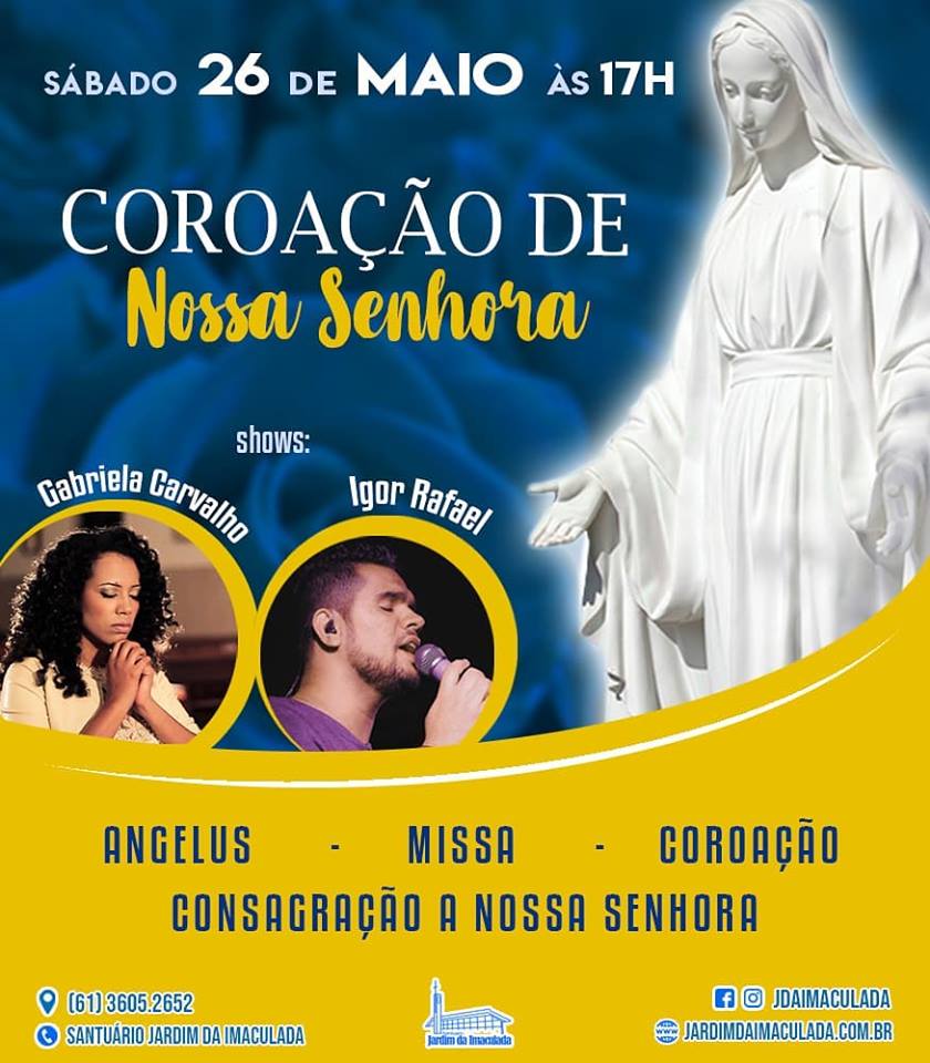 No último sábado (26) deste mês, será realizada no Convento-Santuário “Jardim da Imaculada”, na Cidade Ocidental (GO), a Coroação de Nossa Senhora, uma grande festa em honra à Nossa Mãe e que já se tornou tradição na região do Jardim. O evento iniciará às 17h, com os shows de Igor Rafael e Gabriela Carvalho. Logo após, às 18h acontecerá o Ângelo, com a Santa Missa às 19h, em que se ordenarão os novos consagrados. Terminando a noite, a partir das 20h30 será celebrada a Coroação de Nossa Senhora com grande queima de fogos.