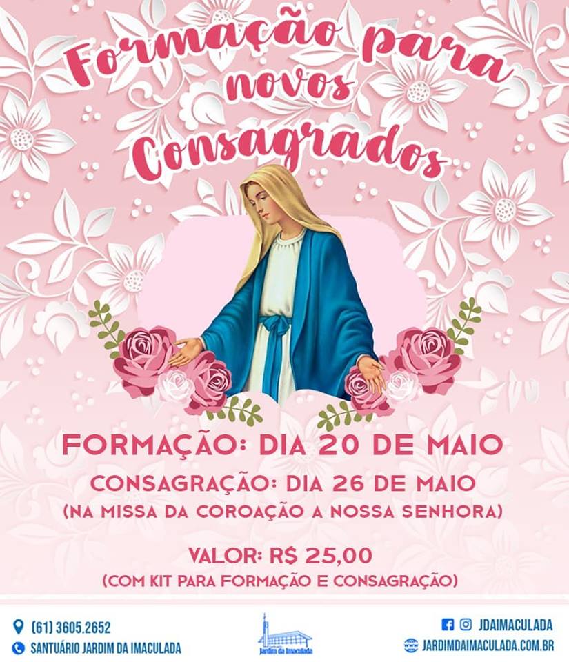 No domingo, 20, acontecerá a Formação Para Novos Consagrados, que será ministrada pelos Freis Amilton Nascimento e Antônio Martins. Os novos integrantes e as novas integrantes da Milícia da Imaculada serão consagrados durante a Santa Missa da Coroação de Nossa Senhora. A inscrição custa R$25 e será disponibilizado um kit para a formação e consagração.