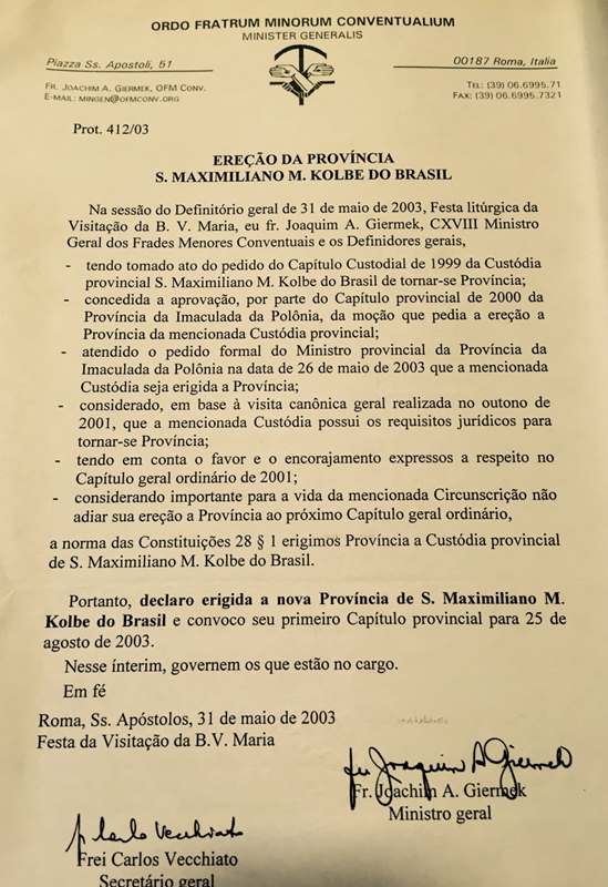 "Na data de hoje recebemos a notícia, por parte do Ministro Geral, da ereção da Província São MaximilianoMaria Kolbe do Brasil o que fez com que nós, agradecidos pela surpresa, prorrompêssemos em júbilo e exultação". Com essas palavras o Custódio Provincial da época, Frei João Benedito Ferreira de Araújo escreveu a todos os frades da Custódia a alegria da ereção canônica da parte do governo geral da Ordem da nova Província Brasileira de São Maximiliano.
