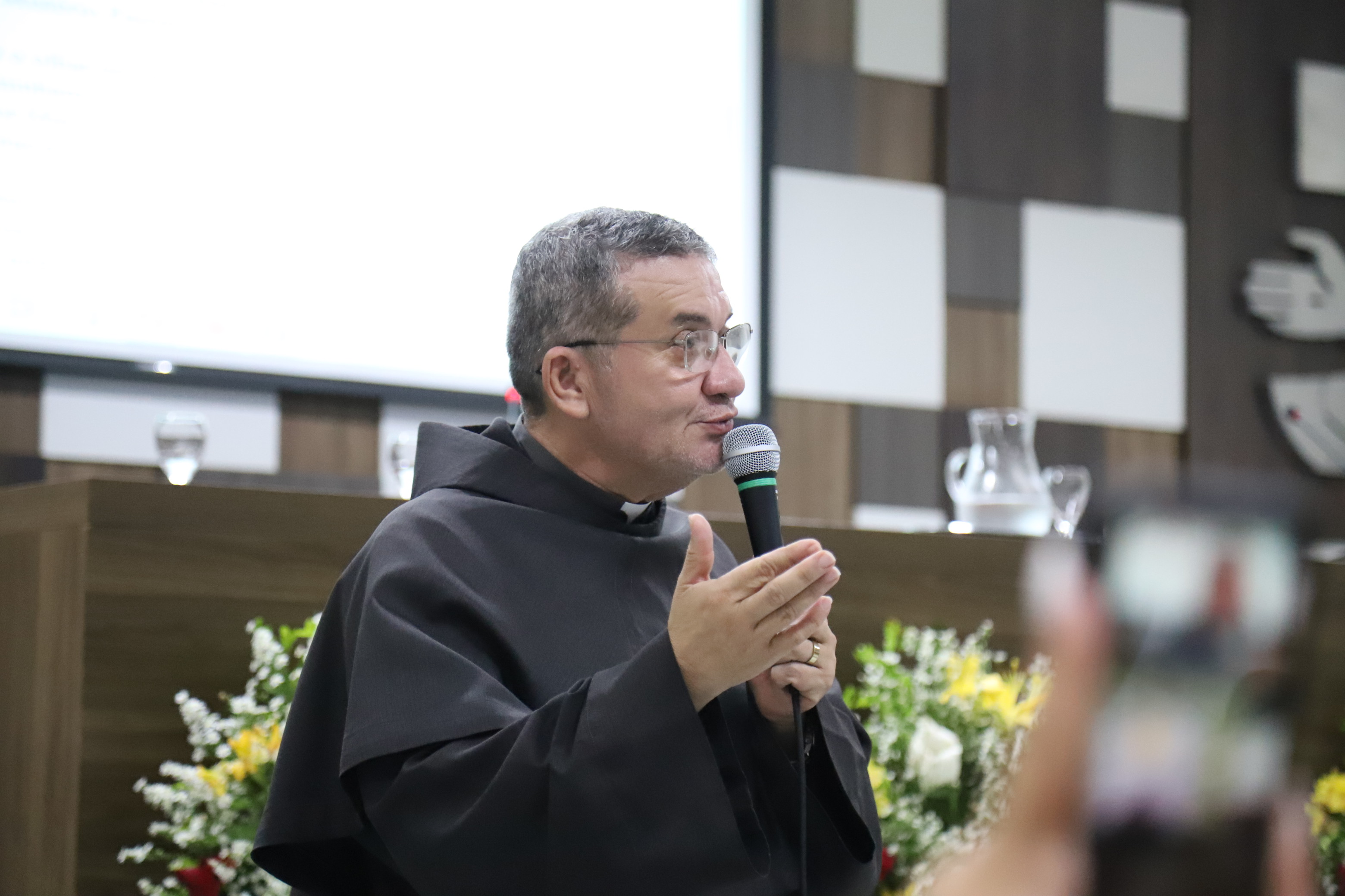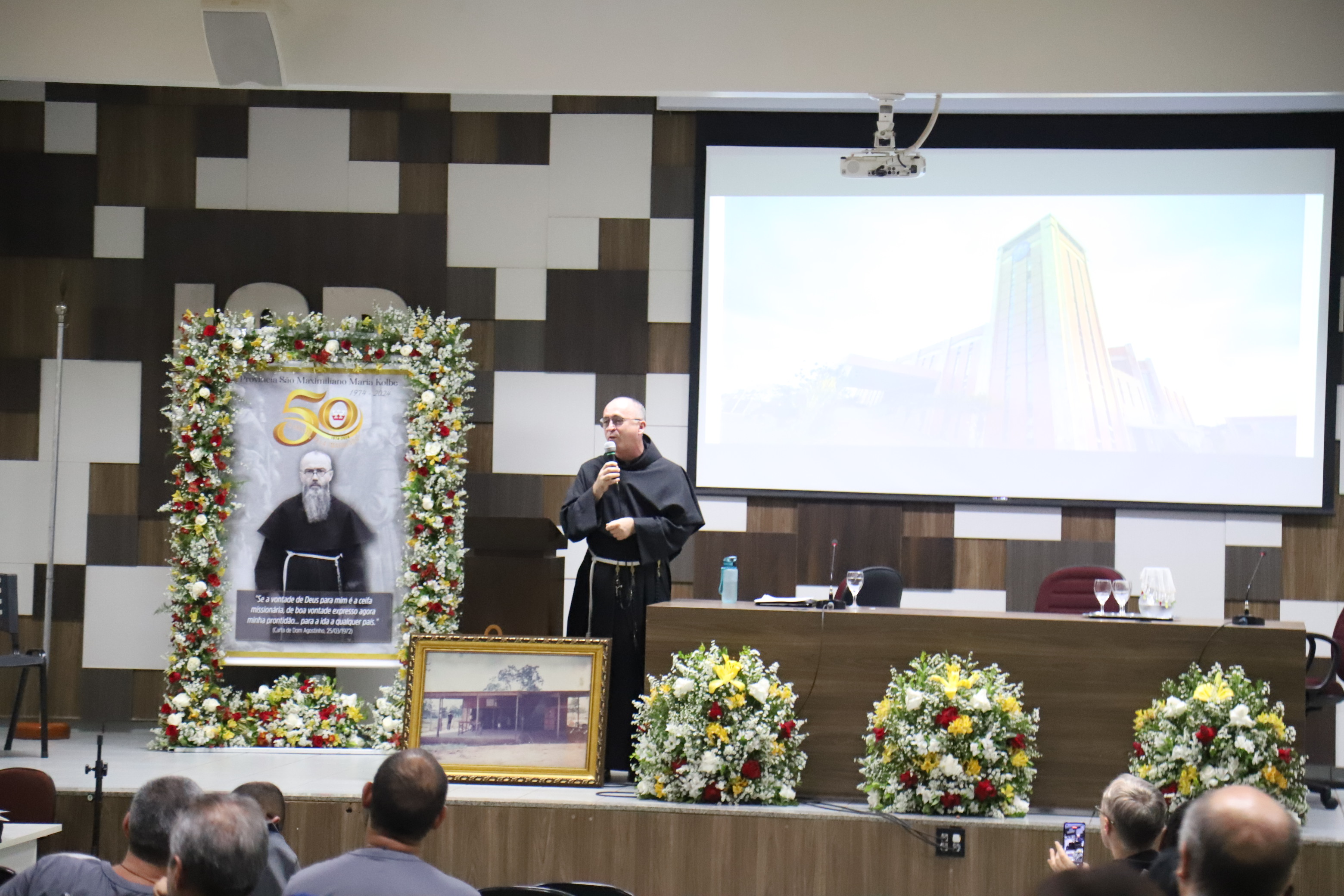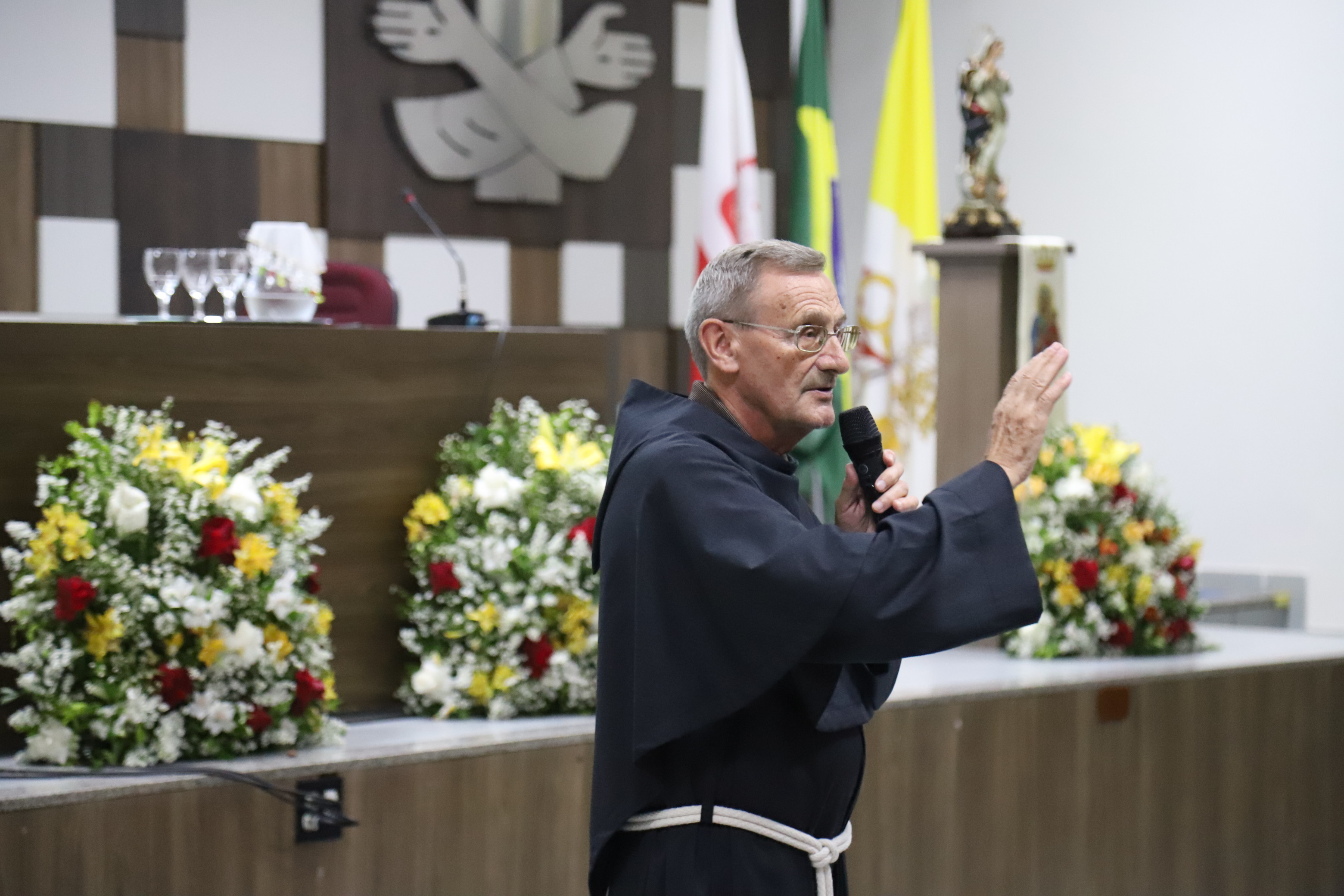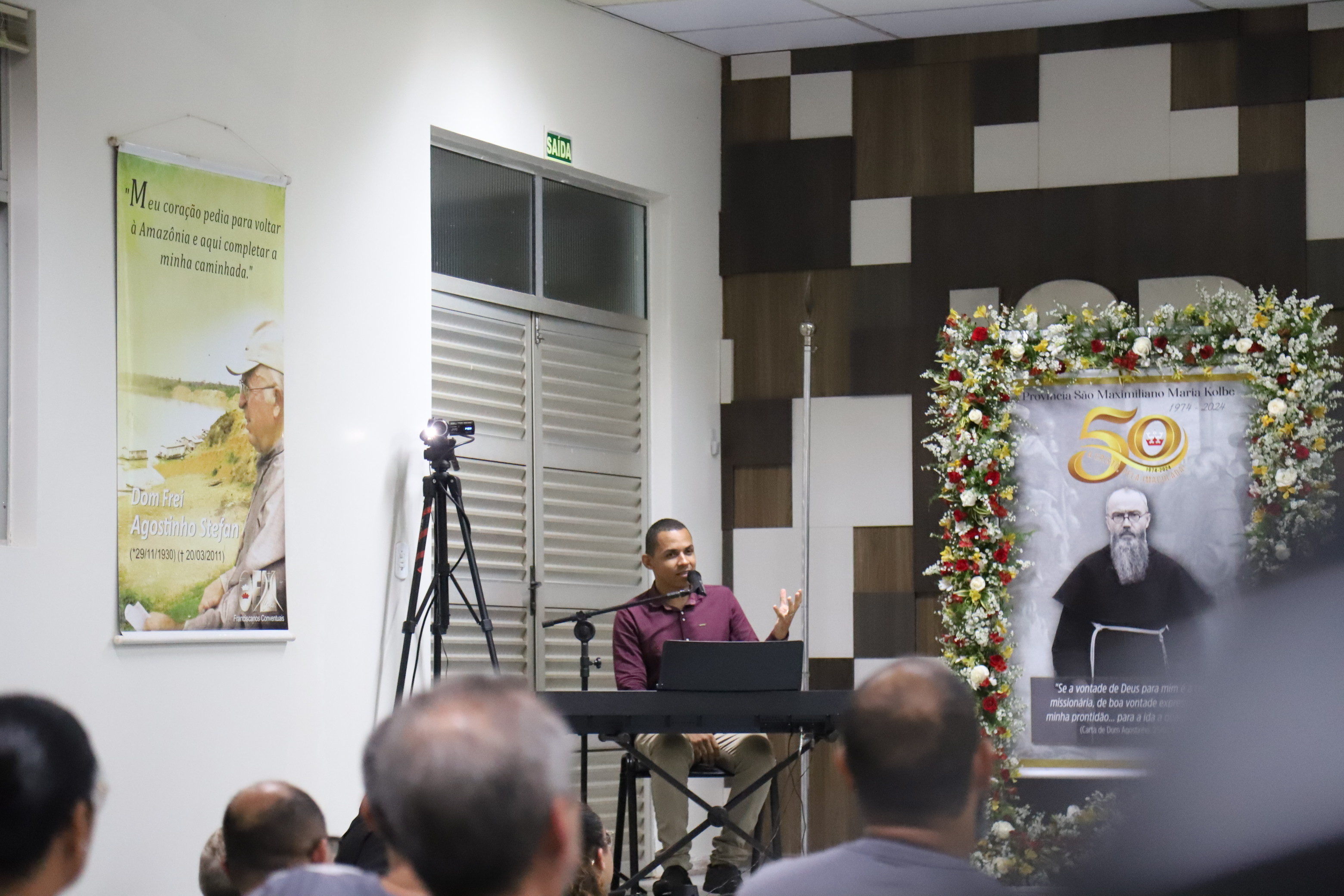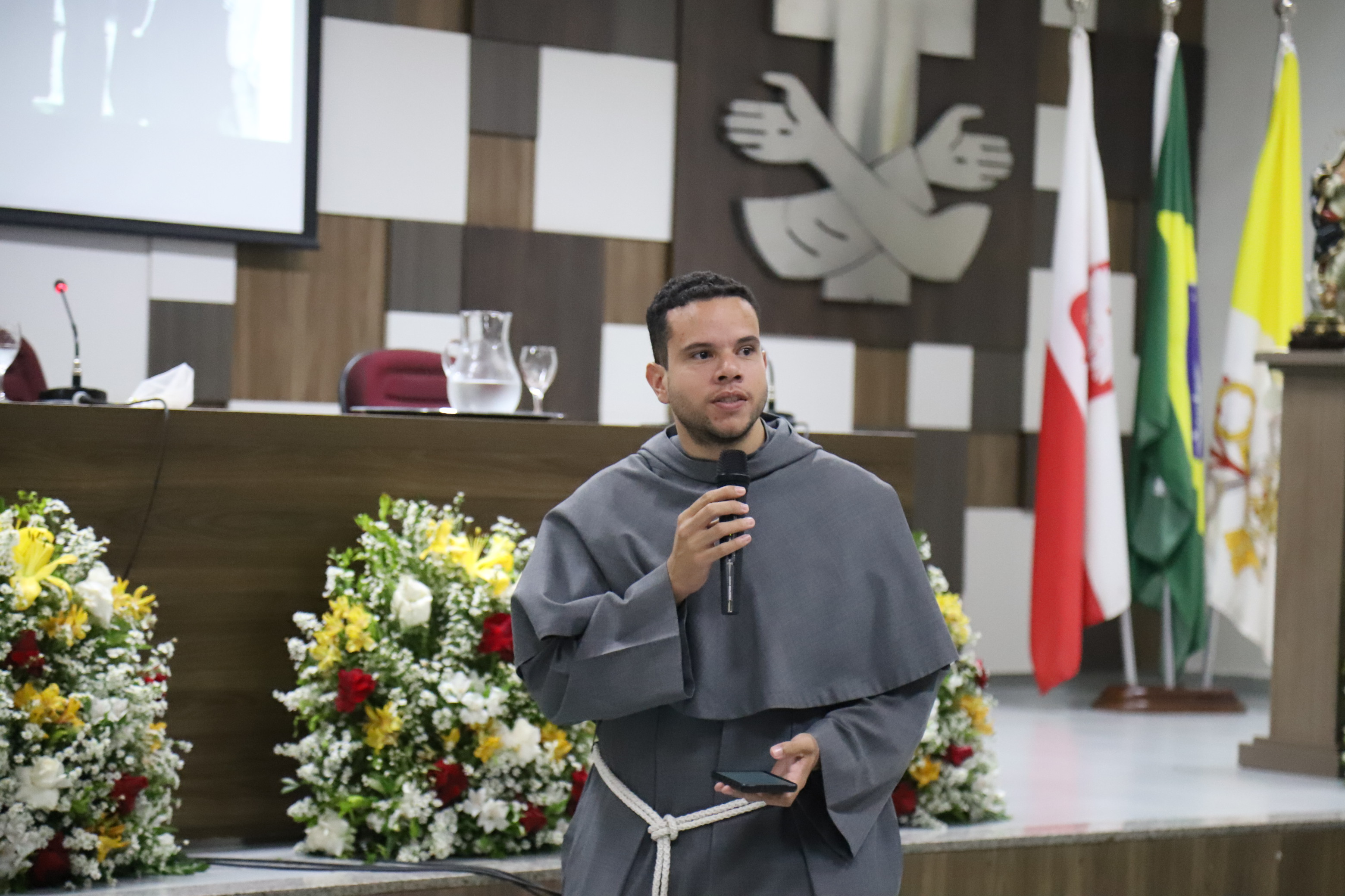 Na sequência, Frei Jorge Elias Oliveira Machado, pároco da Paróquia São Maximiliano, compartilhou um pouco da história da comunidade, lembrando a primeira missa realizada por Dom Agostinho e o fundamento da paróquia em 1999. Ele destacou o trabalho do Frei Amilton, que construiu mais dez comunidades, e os relatos de Juliana e Elton, que finalizaram a apresentação da história da Paróquia São Maximiliano, ressaltando a dedicação e o amor que permeiam a missão franciscana.