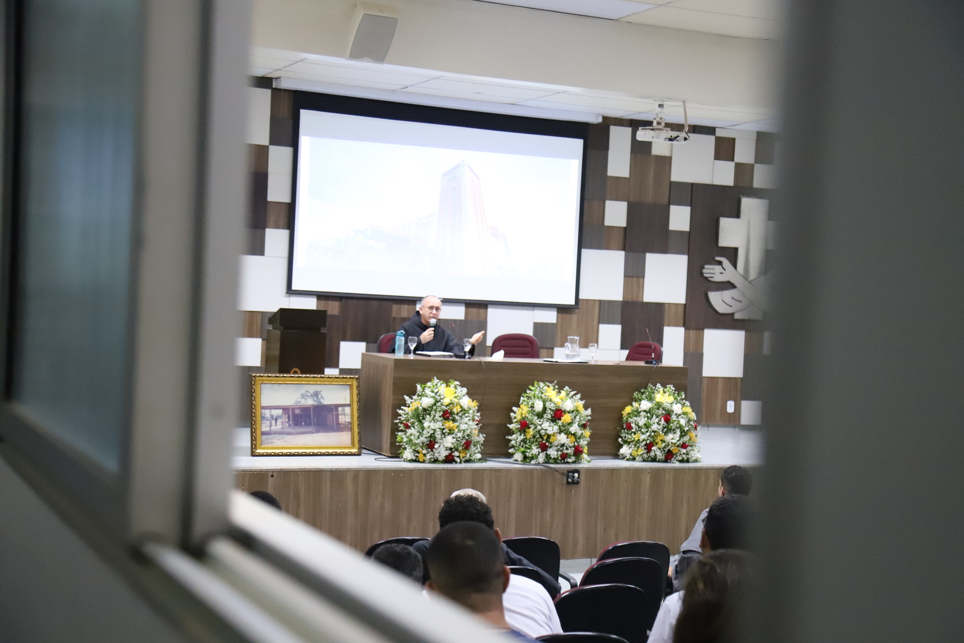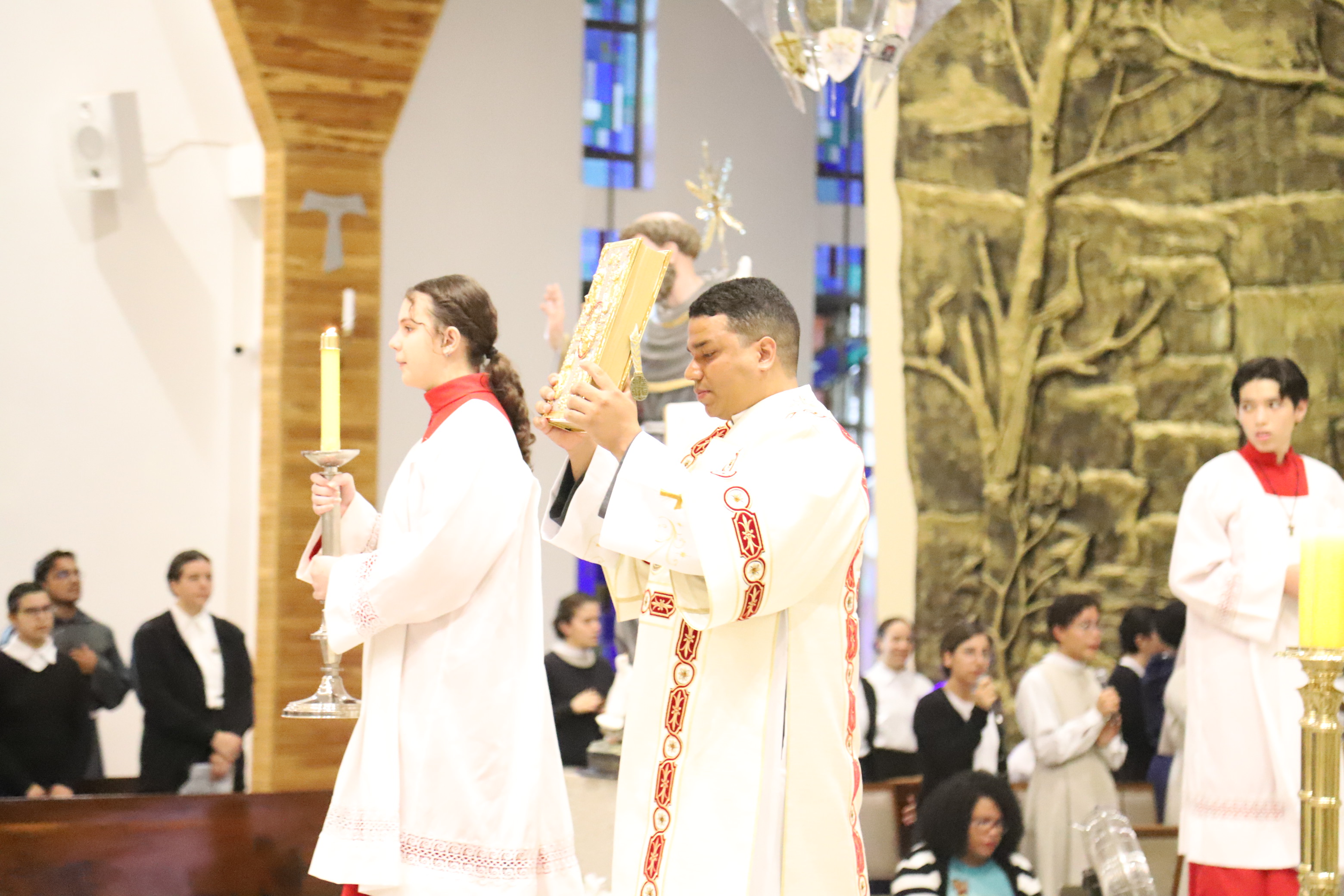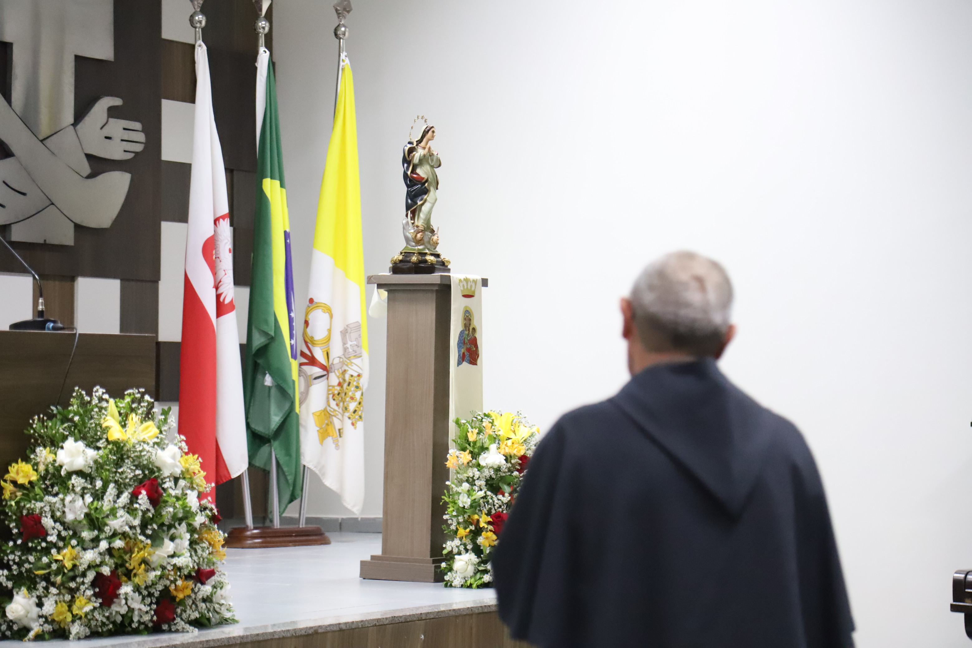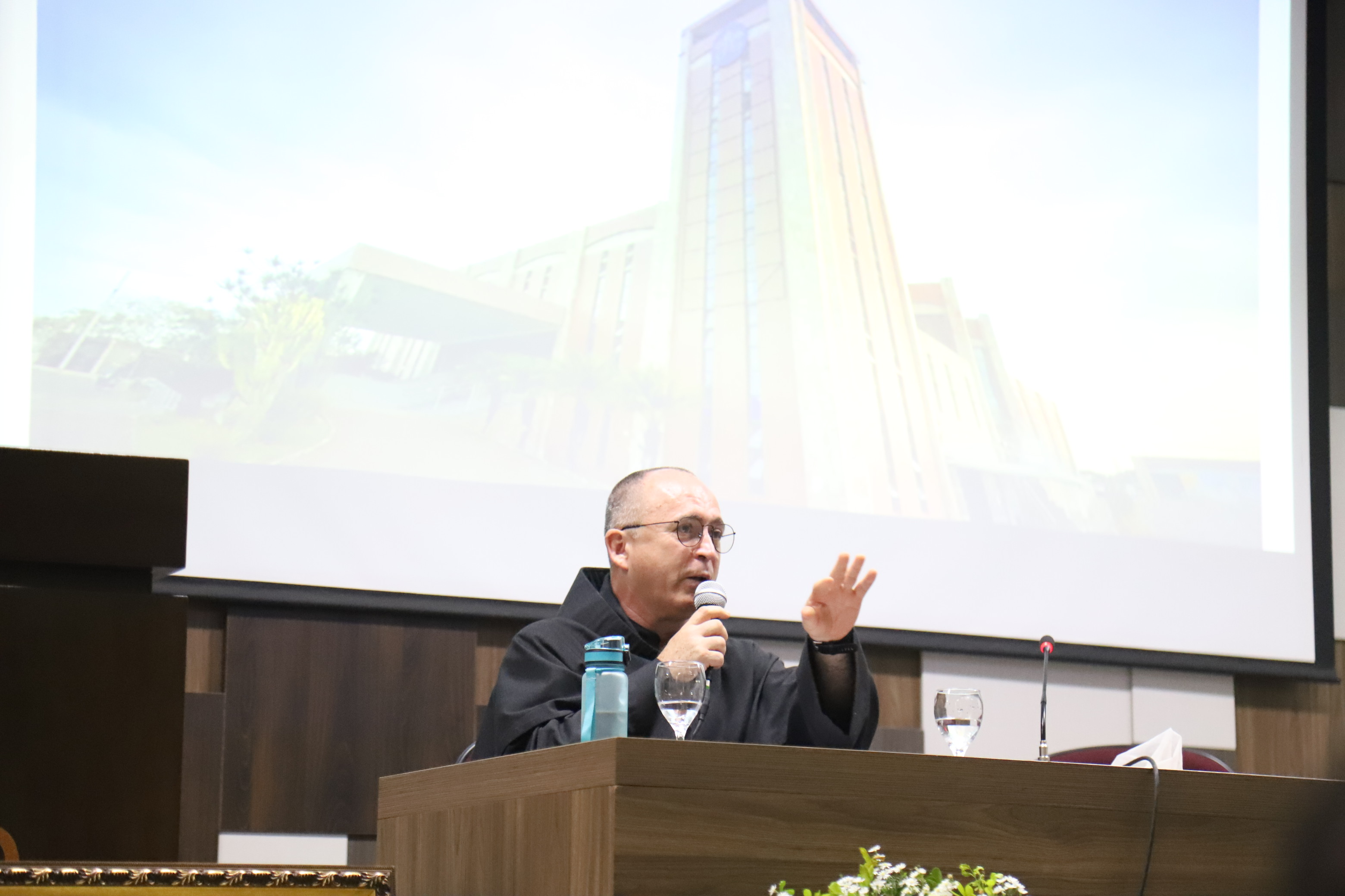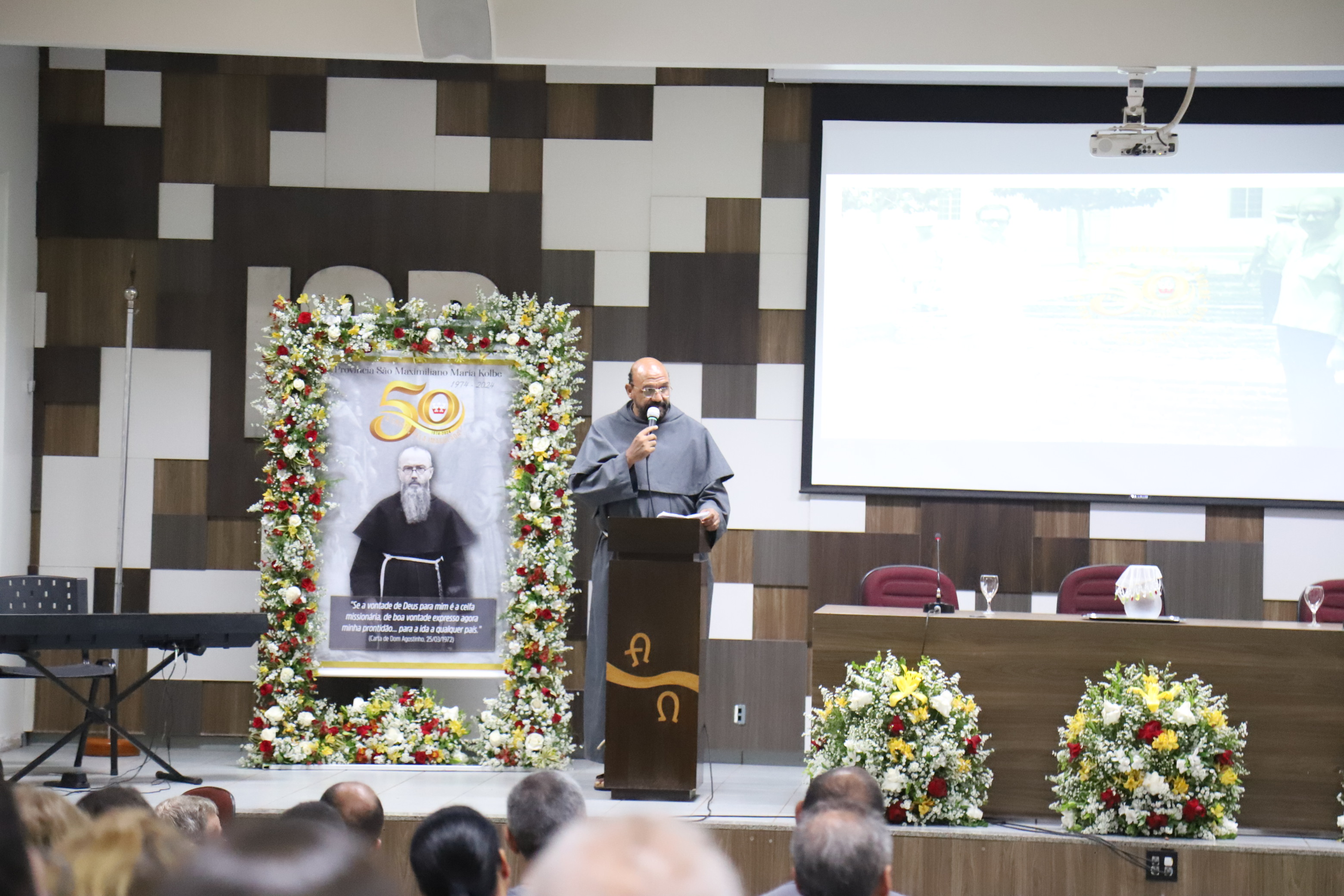 Na sequência, Frei Jorge Elias Oliveira Machado, pároco da Paróquia São Maximiliano, compartilhou um pouco da história da comunidade, lembrando a primeira missa realizada por Dom Agostinho e o fundamento da paróquia em 1999. Ele destacou o trabalho do Frei Amilton, que construiu mais dez comunidades, e os relatos de Juliana e Elton, que finalizaram a apresentação da história da Paróquia São Maximiliano, ressaltando a dedicação e o amor que permeiam a missão franciscana.