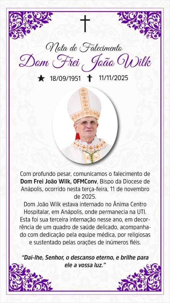 ㅤㅤCom profundo pesar, noticiamos o falecimento de Dom João Wilk, ocorrido na terça-feira, 11 de novembro de 2025. Bispo dedicado e amplament...