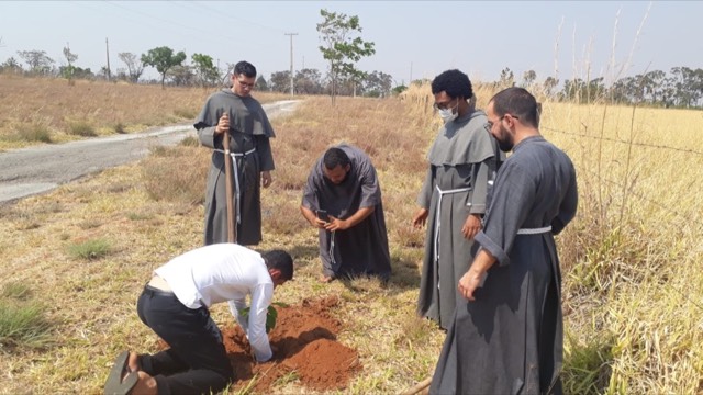 Frades da Casa de Formação e irmãos da Ordem Franciscana Secular plantam mudas de Ipês no Mosteiro das Clarissas