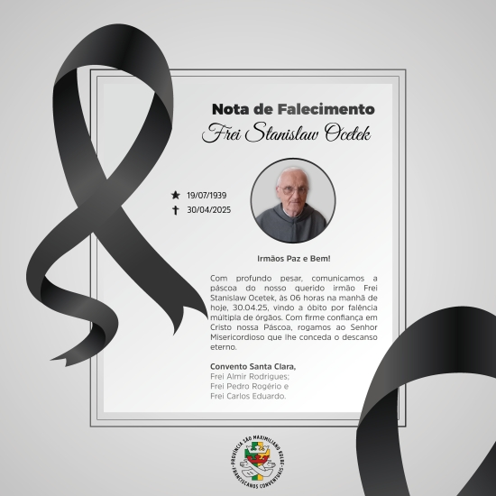 Irmãos Paz e Bem! Com profundo pesar, comunicamos a páscoa do nosso querido irmão Frei Stanislaw Ocetek, às 06 horas na manhã de hoje...